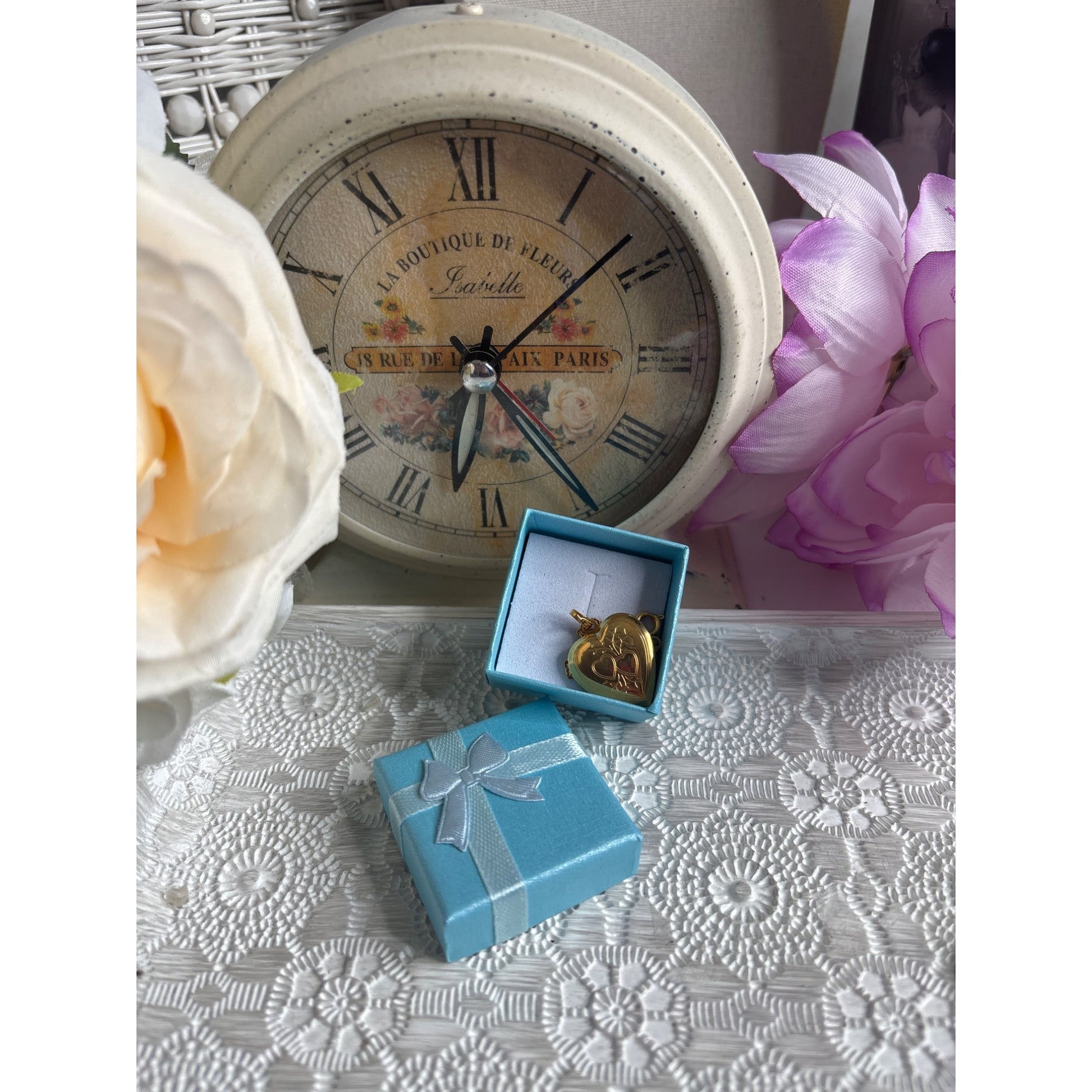 This charming gold-tone locket necklace features a delicate floral engraving on its heart-shaped design. Presented in a blue gift box, it evokes timeless sentimentality.