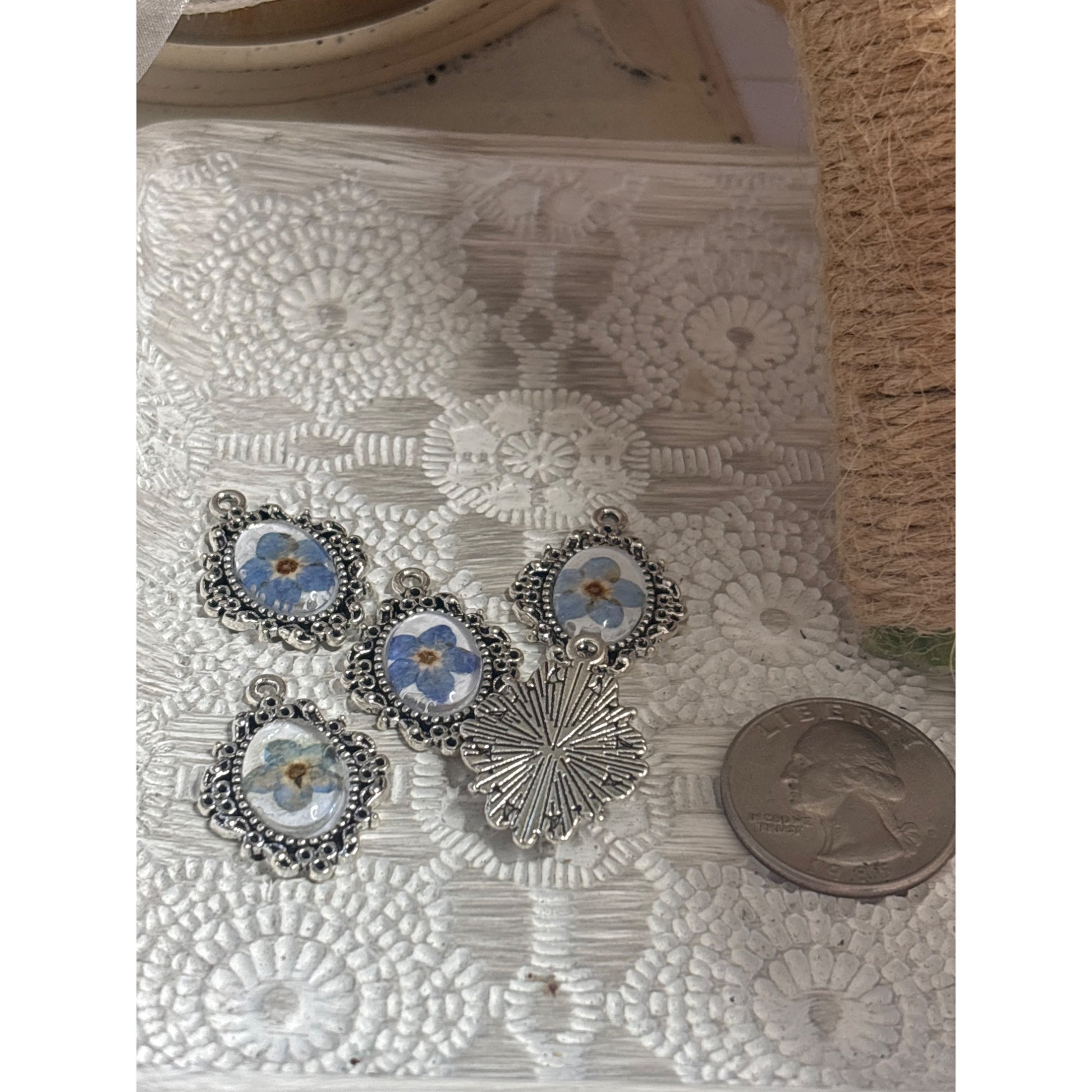 Delicately crafted with preserved forget-me-not flowers, these antique-inspired silver frame charms exude timeless elegance. Ideal for jewelry making or vintage-style crafts.