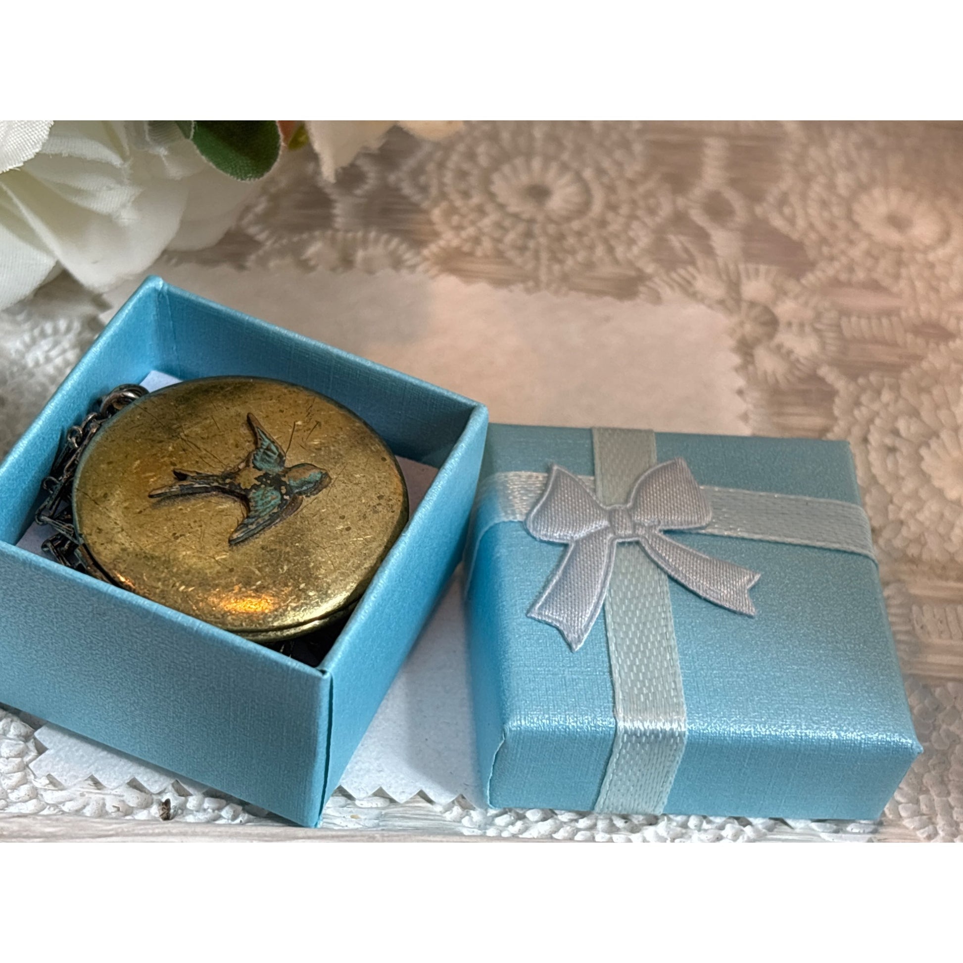 Crafted with vintage charm, this brass locket necklace features a delicate bird design, the swallow, a comforting symbol for those who have lost a loved one. The patina showcases its age, making it a unique keepsake.
