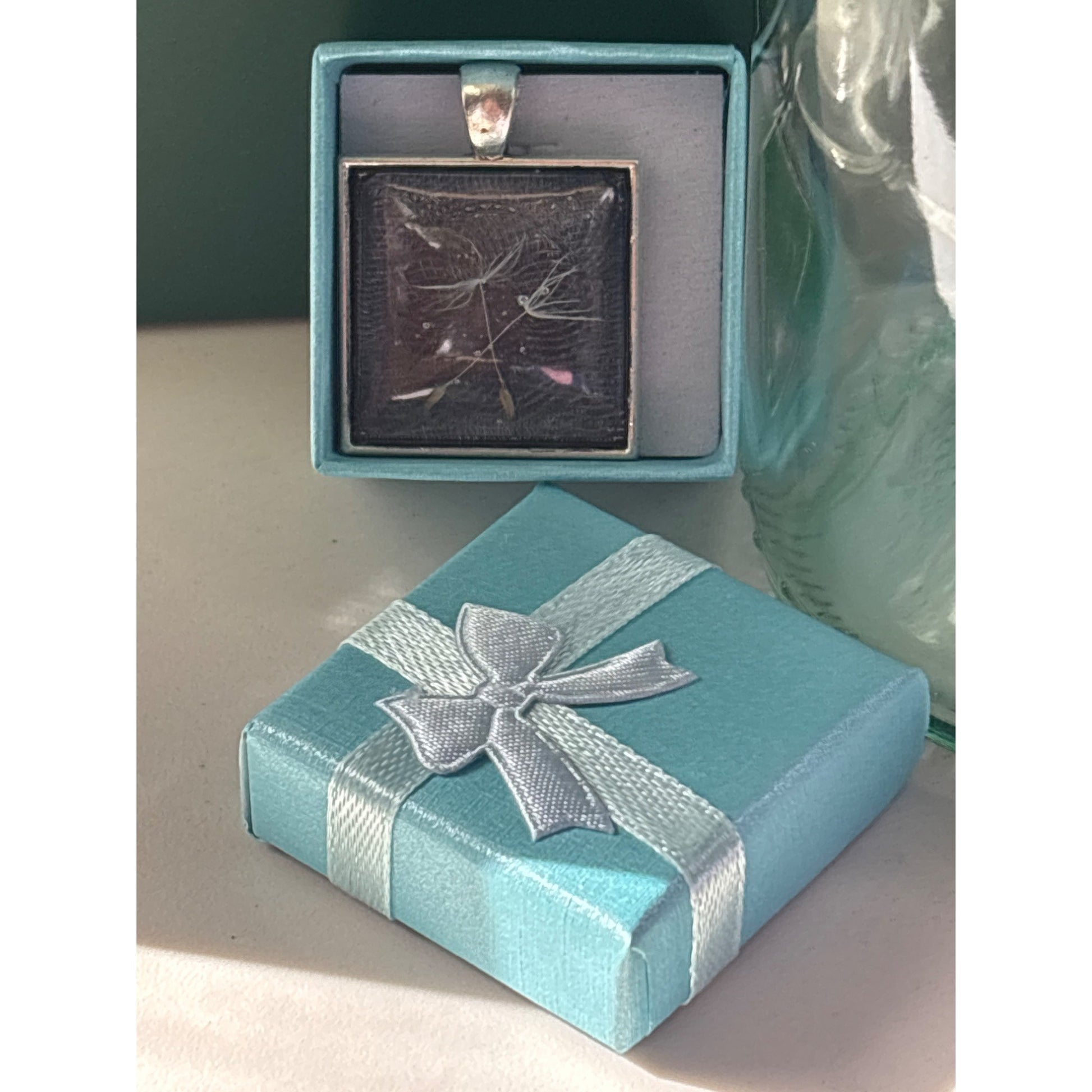 This delicate square pendant captures the ephemeral beauty of dandelion seeds, preserved under resin. The silver-tone frame adds a touch of timeless elegance.