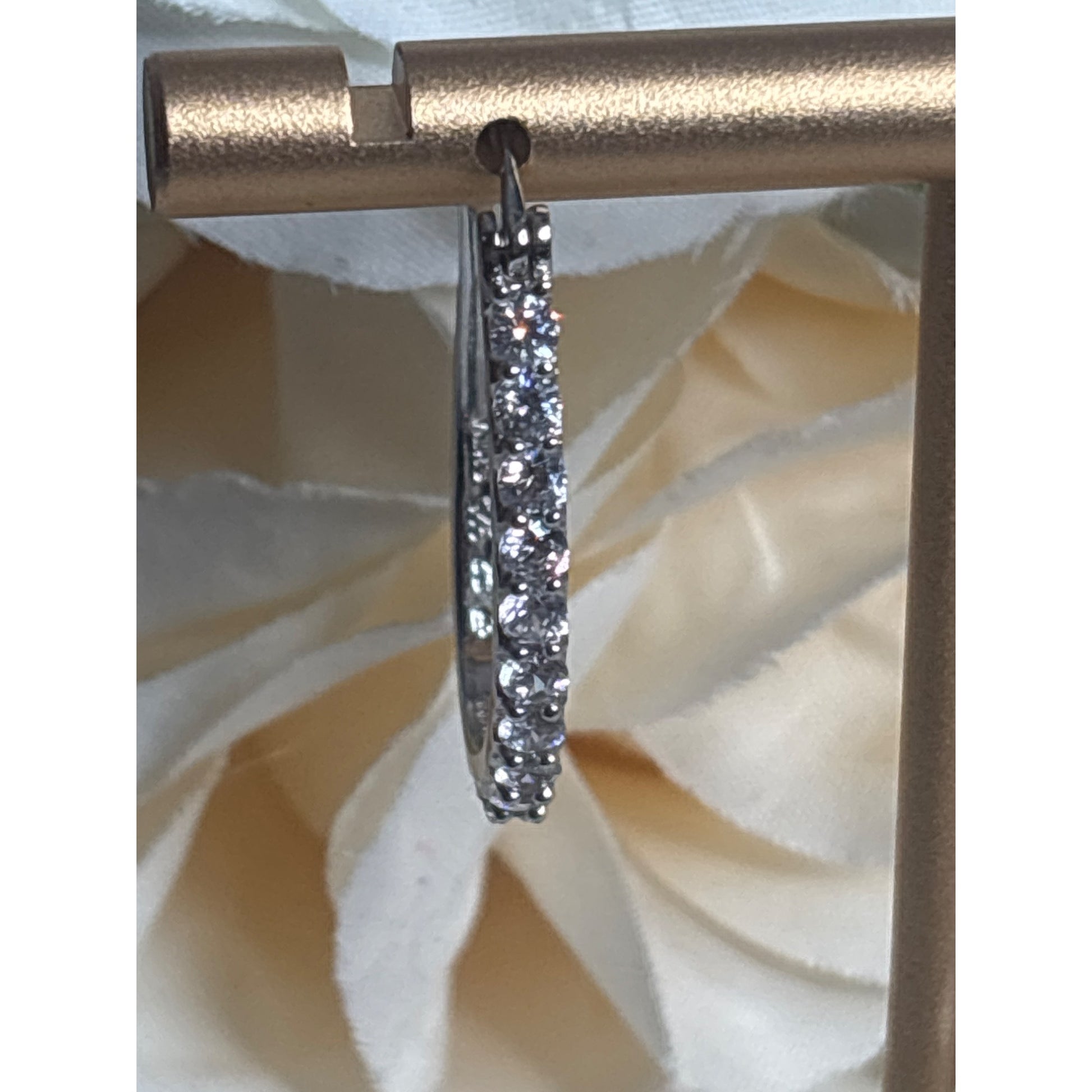 These sterling silver hoop earrings harken back to timeless elegance, graced with shimmering stones that evoke vintage sophistication and charm. A classic accessory.