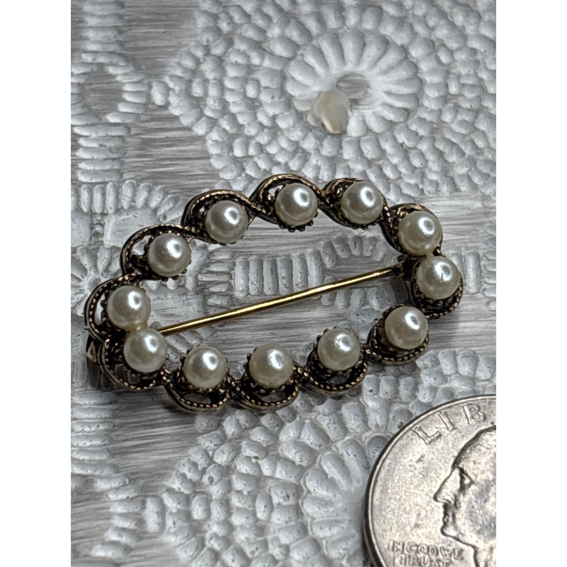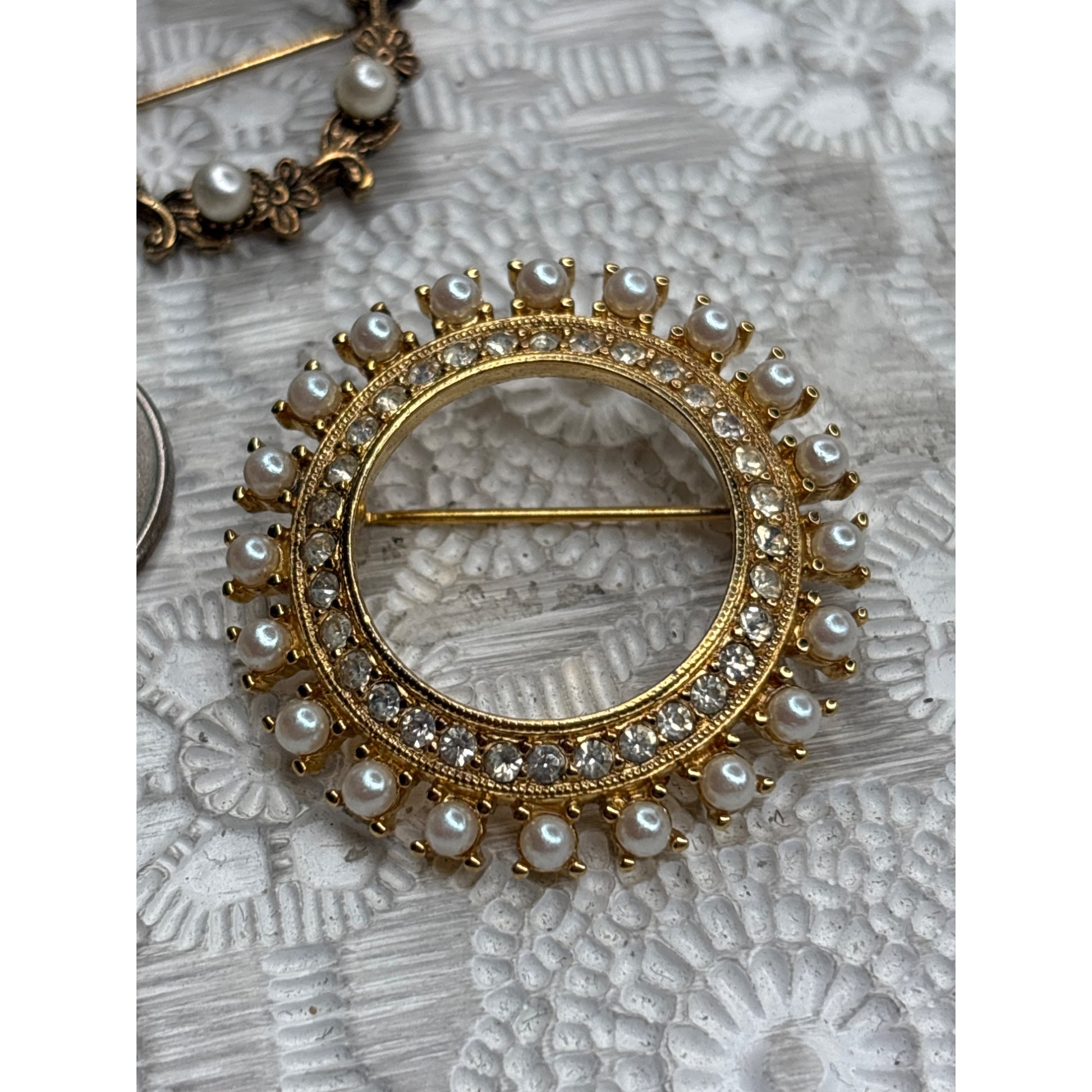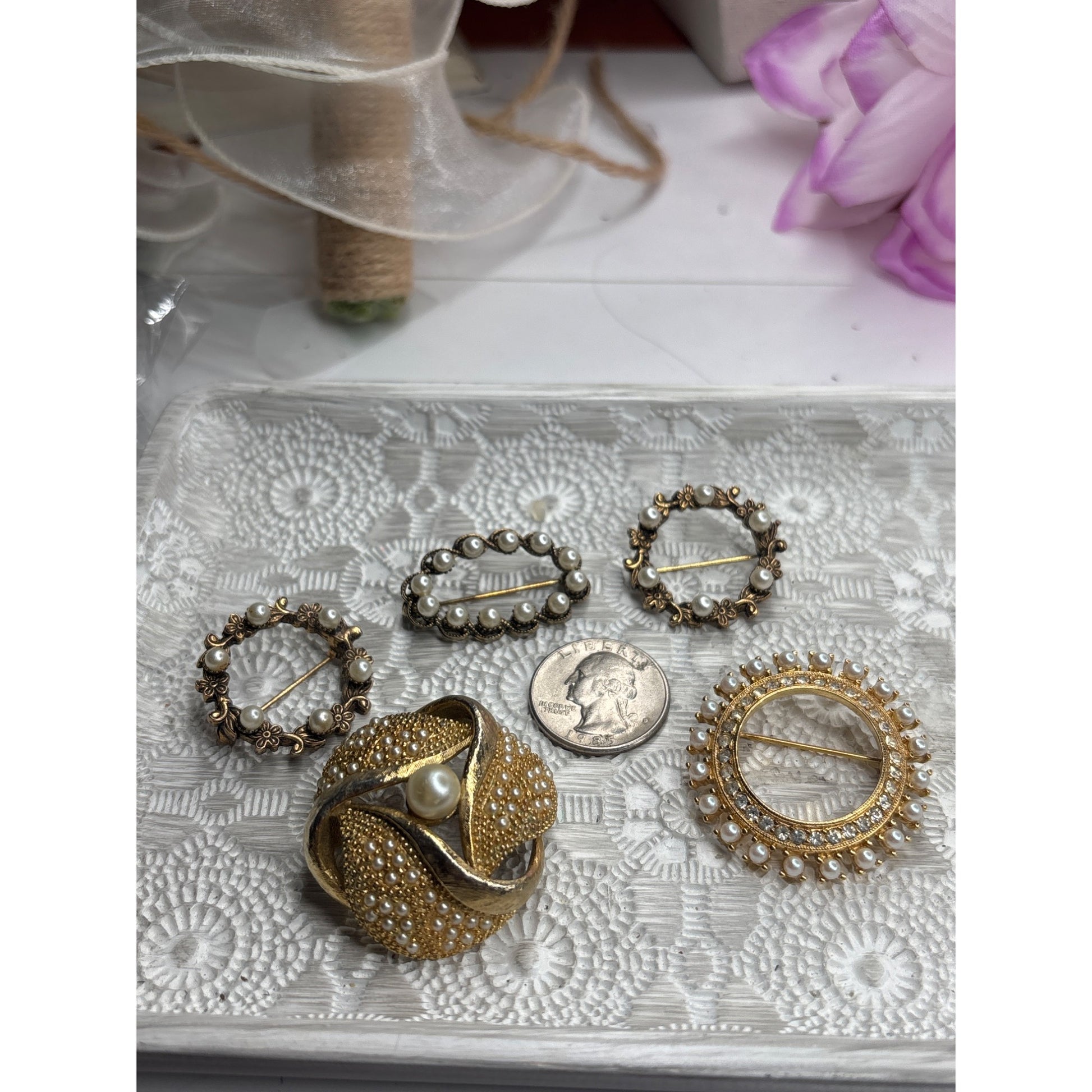 This collection features five vintage brooches with intricate designs. The ART signed piece and faux pearl accents evoke a timeless elegance.