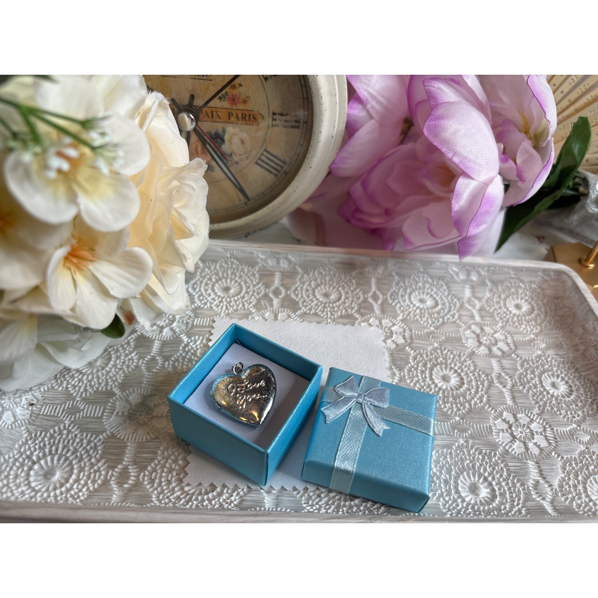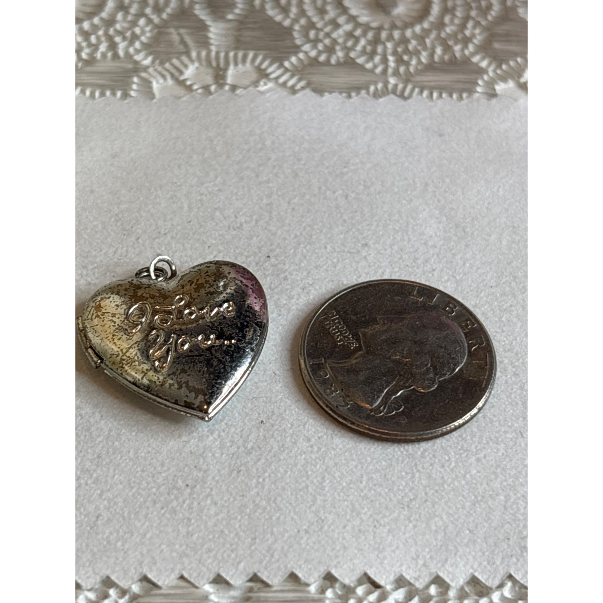 A delicate silver-toned heart locket whispers tales of romance, its weathered surface telling stories of cherished memories and tender moments passed between lovers. The subtle patina and intricate "I Love You" script evoke a sense of nostalgic connection.