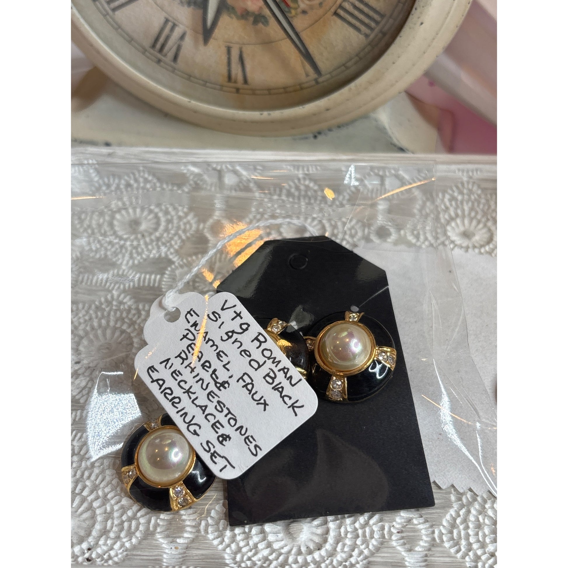 Vtg Roman Black Enamel Faux Pearl Rhinestone Necklace & Earring Set Signed Jewelry