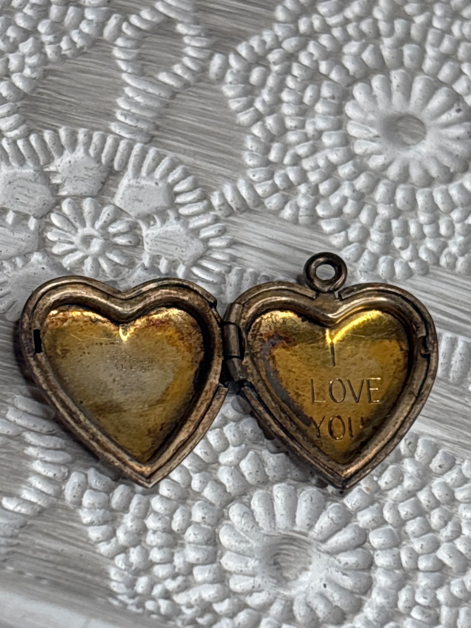 This vintage heart-shaped locket carries a nostalgic charm. Inside, the words "I LOVE YOU" are engraved, adding a unique touch. The exterior features delicate engravings, with a subtle patina, enhancing its antique appeal. This locket is an ideal keepsake for those who cherish sentimental jewelry.