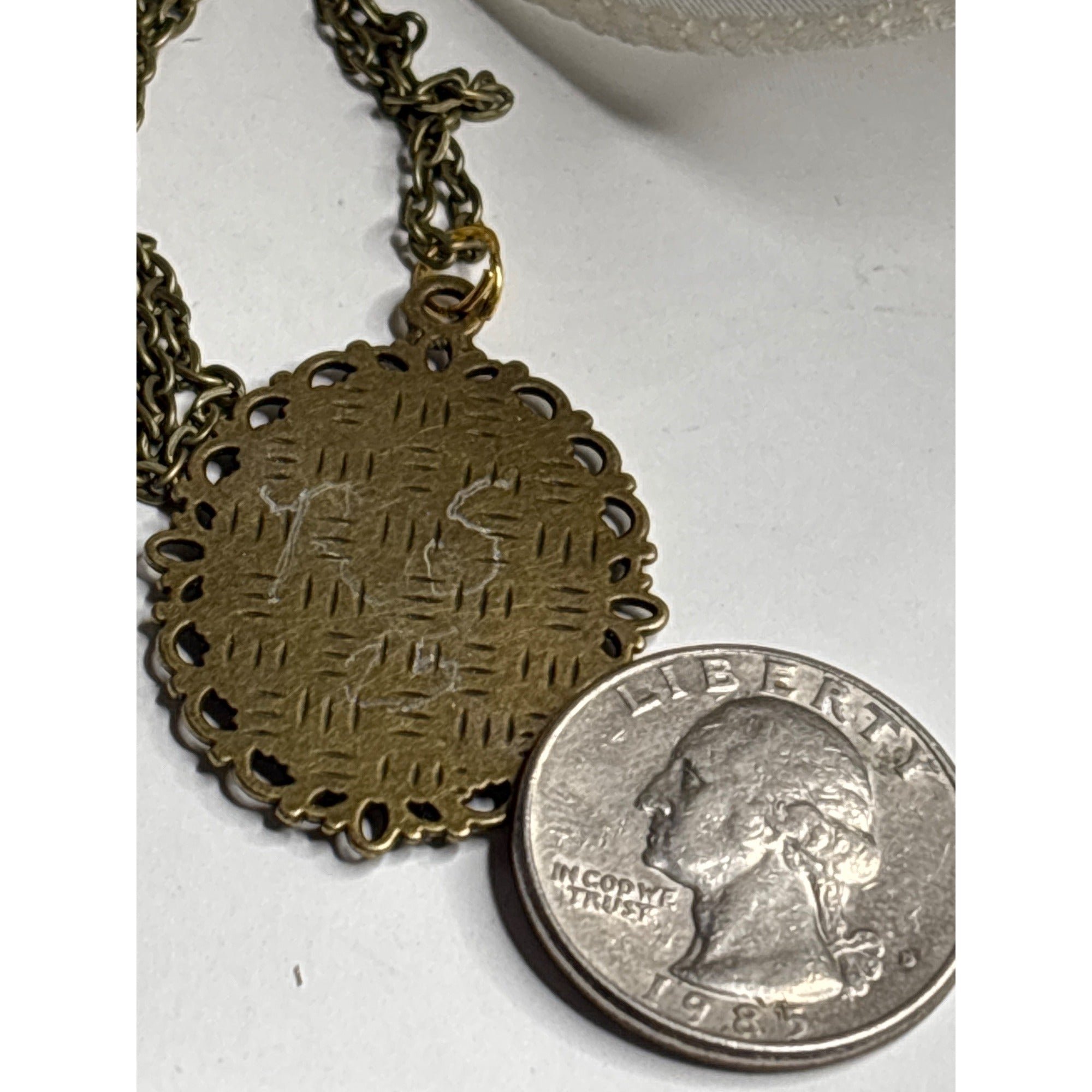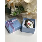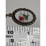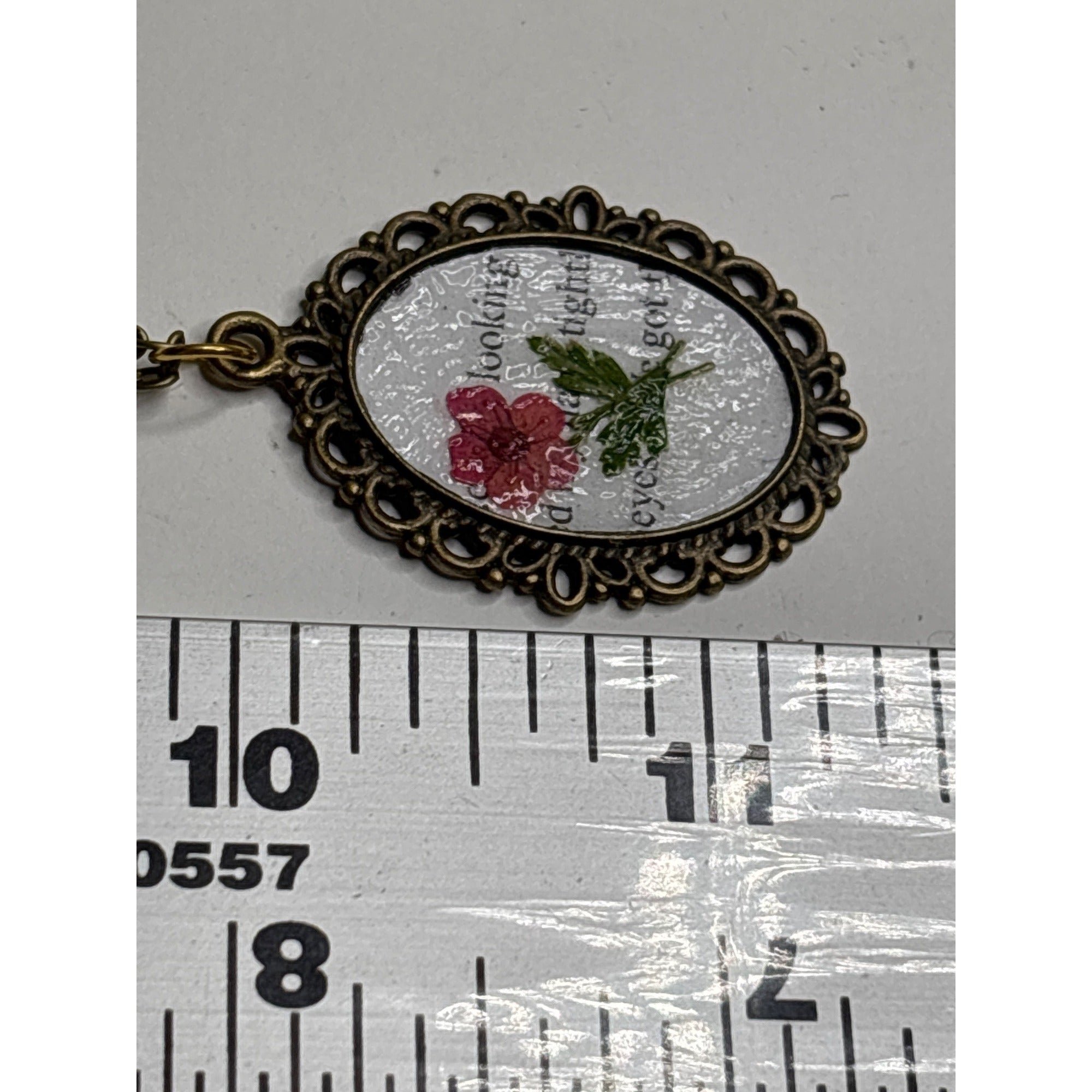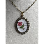 This is a pendant necklace with original art. The background is a page from a vintage book. The flower is made from dried flowers. The back is signed R.S. The size is 18x25 with an 18" chain. Each piece in the Reimagined by the Chateau collection is lovingly curated from auctions and estate sales across the country. We seek out jewelry with history, patina, charm, and soul—pieces that feel like they’ve been waiting for their next chapter.Hand-selected and offered exactly as found, every item preserves its unique age, quirks, and character. Please review all photos carefully, as vintage pieces may show gentle wear that adds to their one-of-a-kind story.Your piece will arrive carefully wrapped in a gift box—ready for giving or treasuring.Curated with love in San Diego, CA.🛠 Care NotesVintage and handmade pieces should be handled gently.Avoid moisture, perfumes, and prolonged sunlight to preserve the finish and detailing.