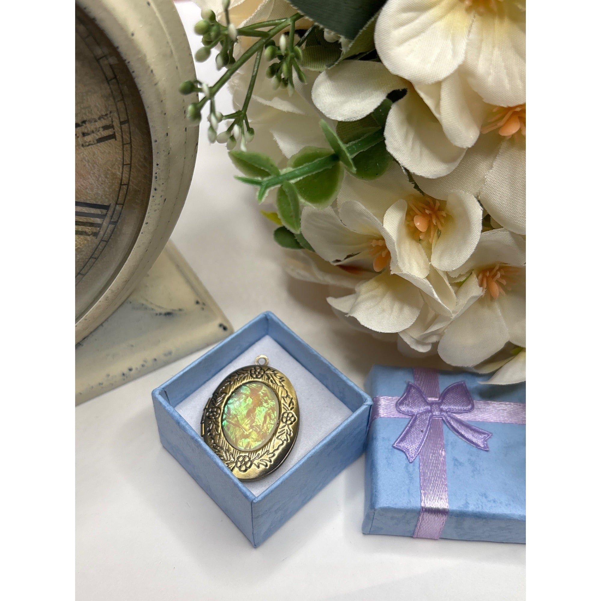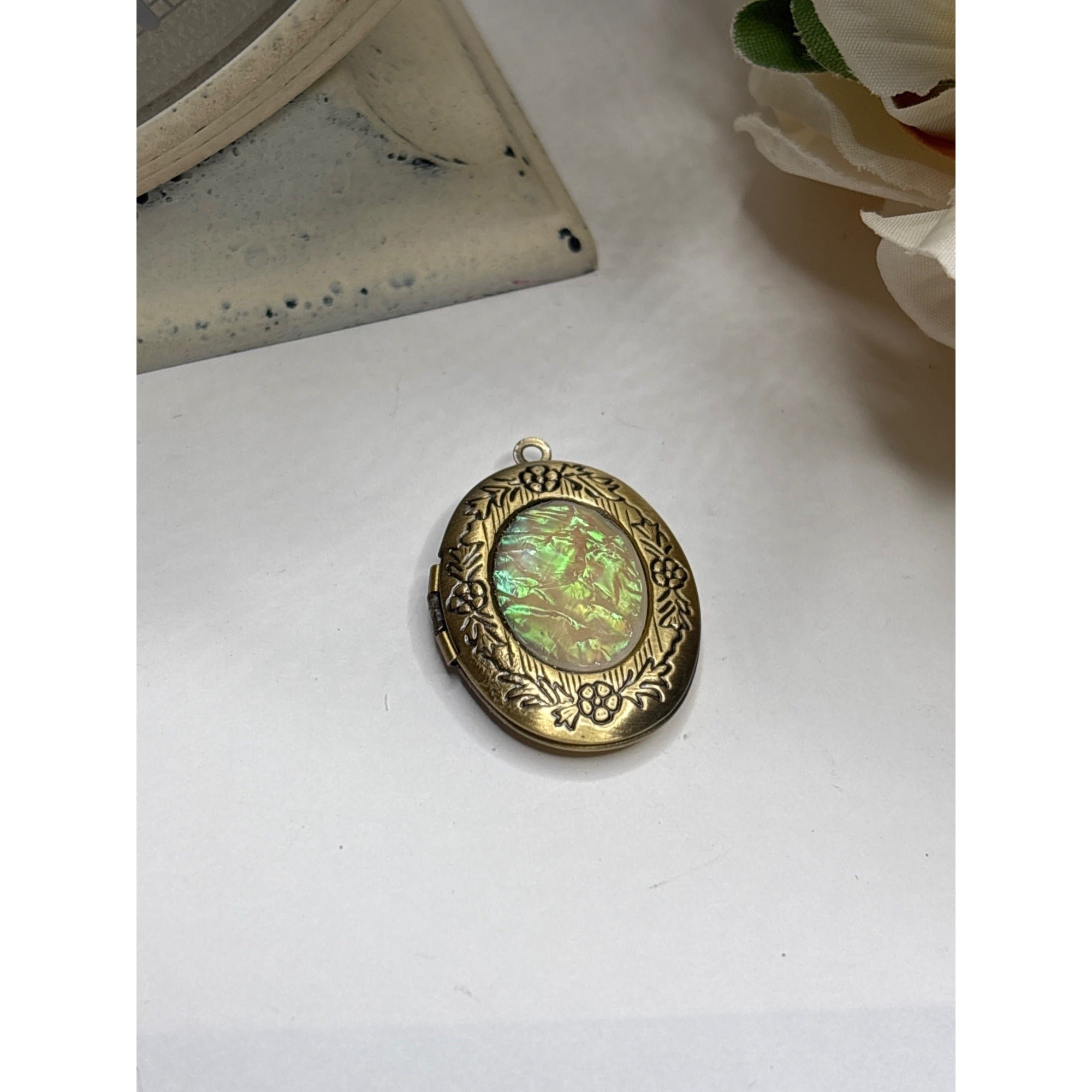 Antique Gold Oval Locket | Iridescent Opal-Like Center & Floral Design
