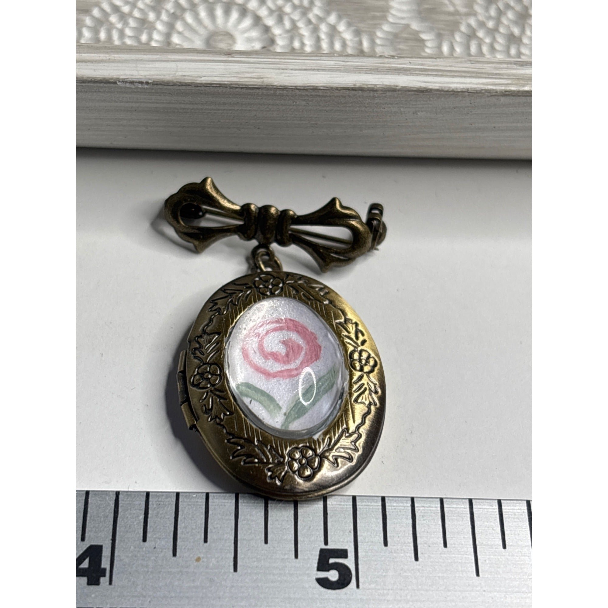 Handmade with care in San Diego, this piece was created by blending modern craftsmanship with vintage, storied materials. This locket combines a vintage bowknot pin, a locket, and a handpainted flower.Because this is a handcrafted item incorporating vintage components, slight imperfections may be present. These are part of the piece’s authentic character and make it truly unique.Please review all photos carefully. All items are sold as is.Item Type☐ Bridal Bouquet Charm☐ Mourning Jewelry☐ Reimagined Locket☐ Brooch / Pin☐ Keepsake CharmCare InstructionsPlease treat your handmade piece with care:• Avoid submerging in water• Avoid prolonged sun exposure• Handle gently to preserve embedded materials• Store in a cool, dry placePackagingEvery item arrives gift-boxed and beautifully packaged, ready for giving or keeping.