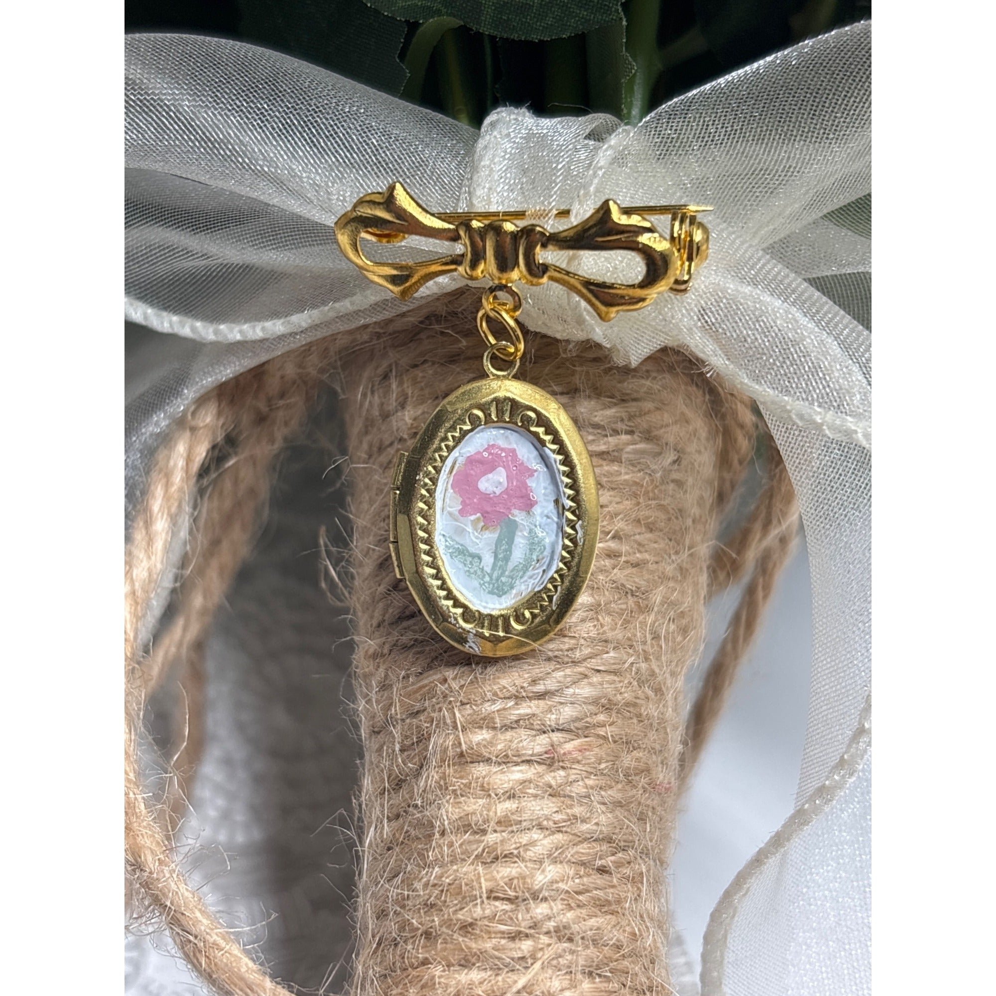 Bridal Bouquet Pin with Locket: Handpainted Pink Flower & Bowknot Pin