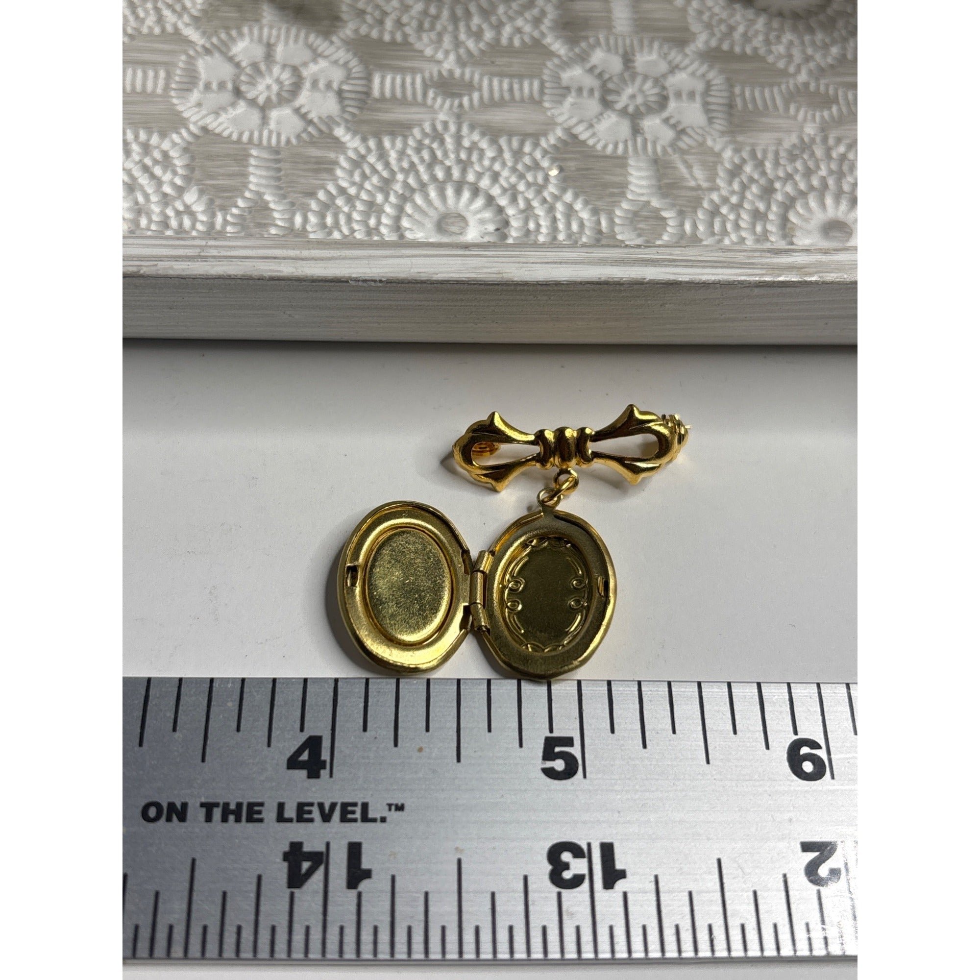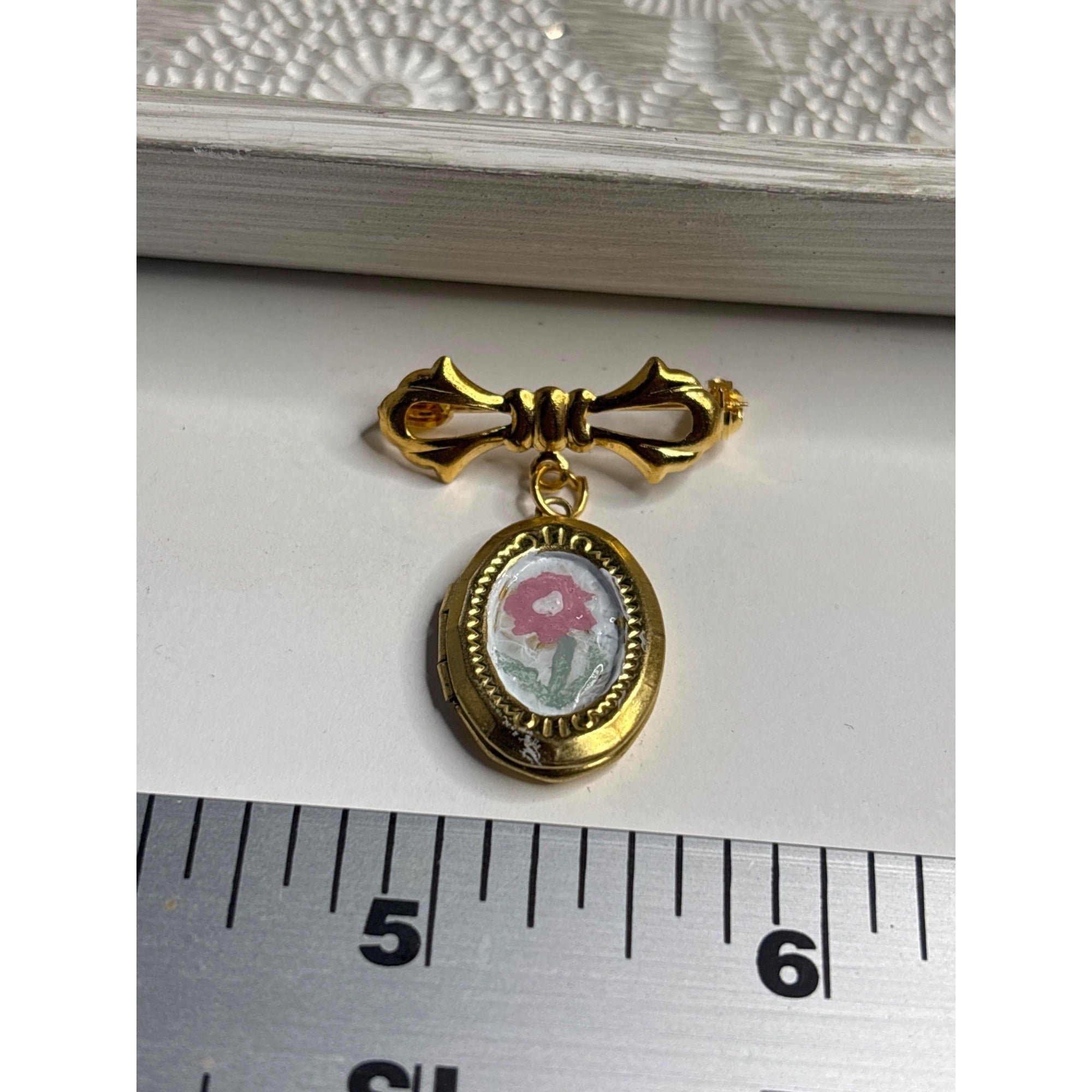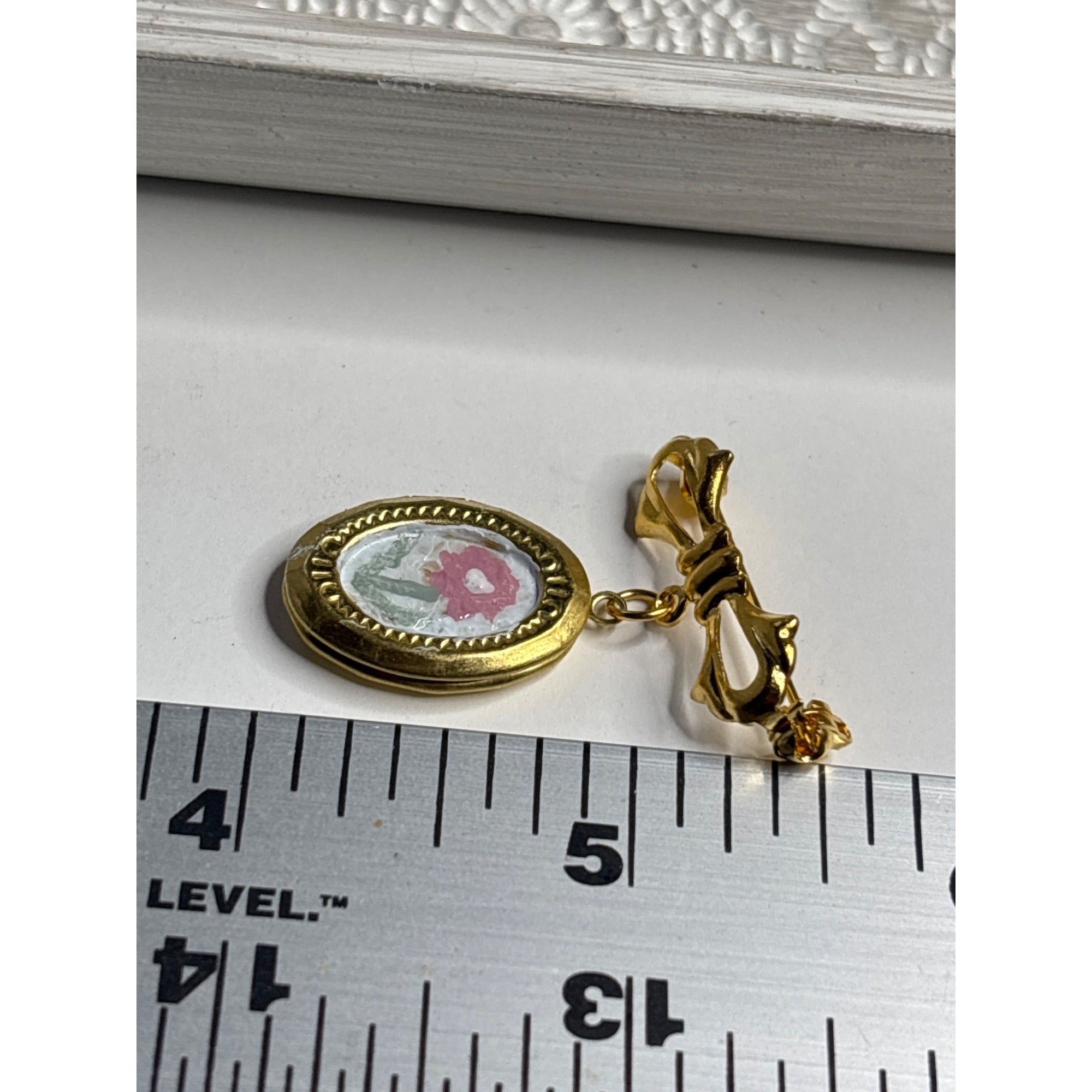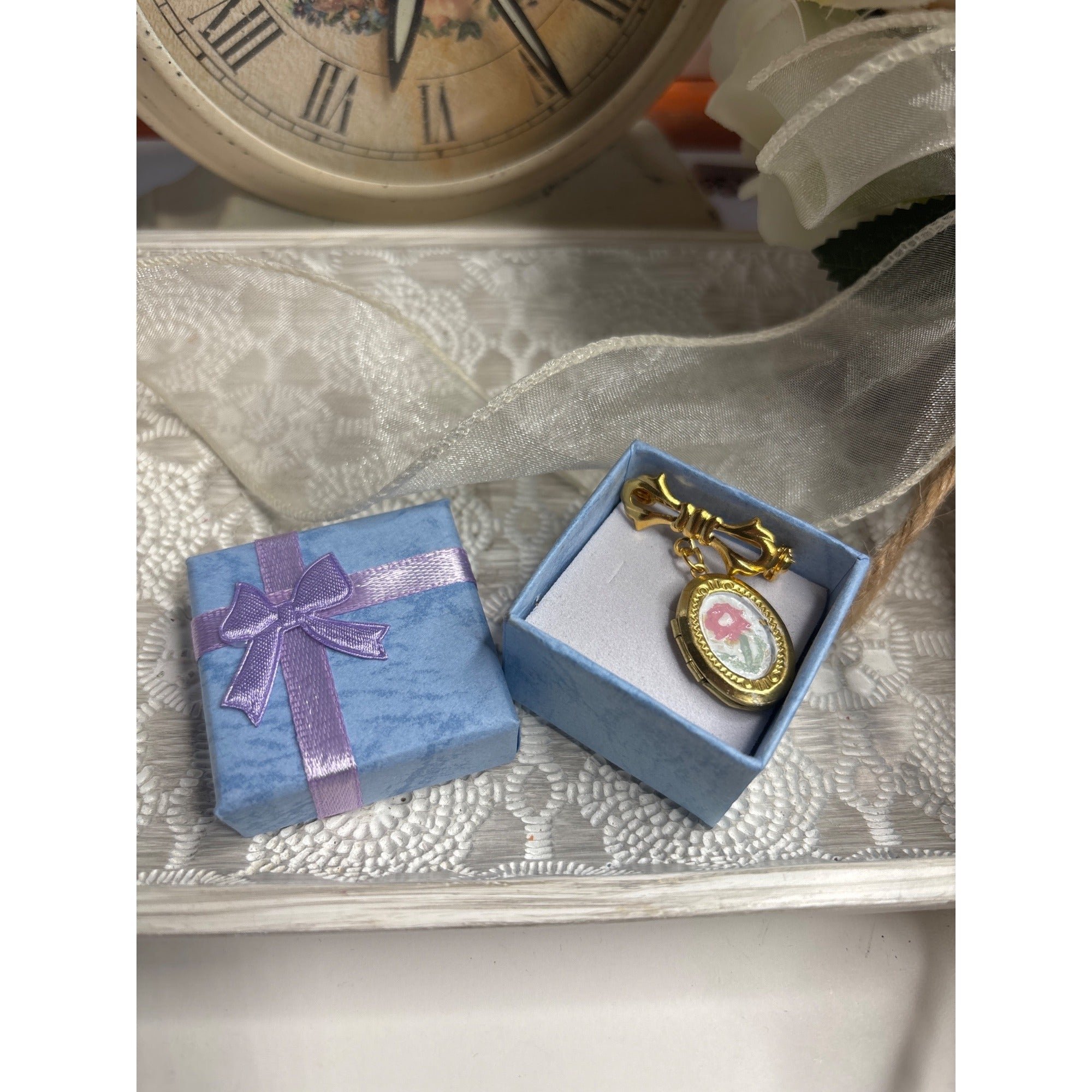 This delicate vintage locket pin combines timeless charm and functionality. The ornate bow accent and pink floral design evoke a sense of nostalgia and elegance.• Gold tone finish with intricate detailing • Functional locket for a small photo or keepsake • Comes in a gift box for safekeeping