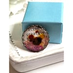 This vintage-inspired brooch features delicate pressed florals encased in glasswith text accents, framed in gold-tone metal. Comes in a charming gift box.• Gold-tone metal frame • Glass with embedded florals & text design • Measures approximately 1 inch in diameter • Includes a decorative blue gift boxNo visible flaws; brooch diameter = 1 inch.