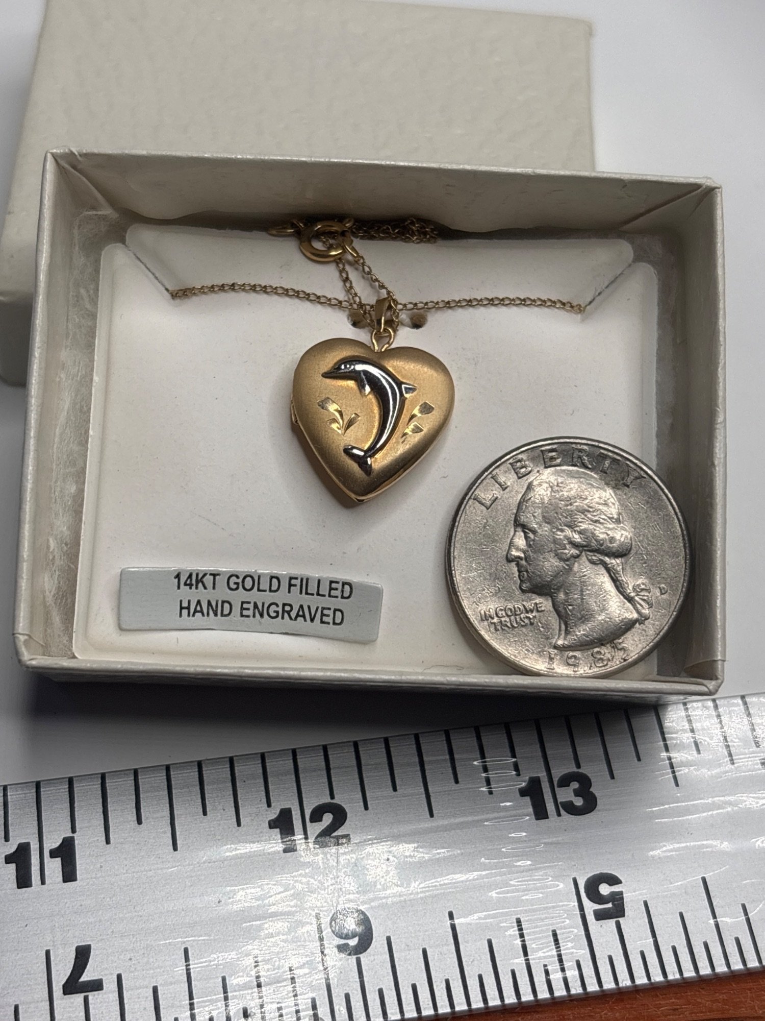 This vintage dolphin photo locket necklace features a hand-etched dolphin design on a 14K gold filled locket, designed to hold a small photograph or meaningful image close to the heart. Often chosen as a sentimental keepsake or symbolic gift, dolphin lockets represent protection, freedom, and enduring connection—making this piece especially meaningful for ocean lovers and memory-keeping jewelry collectors.