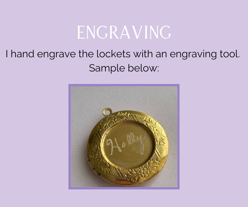 I can engrave any locket on the back, front or inside. I engrave by hand with an engraving tool, so no engraving is ever exactly the same. I will reach out to you about your engraving.
