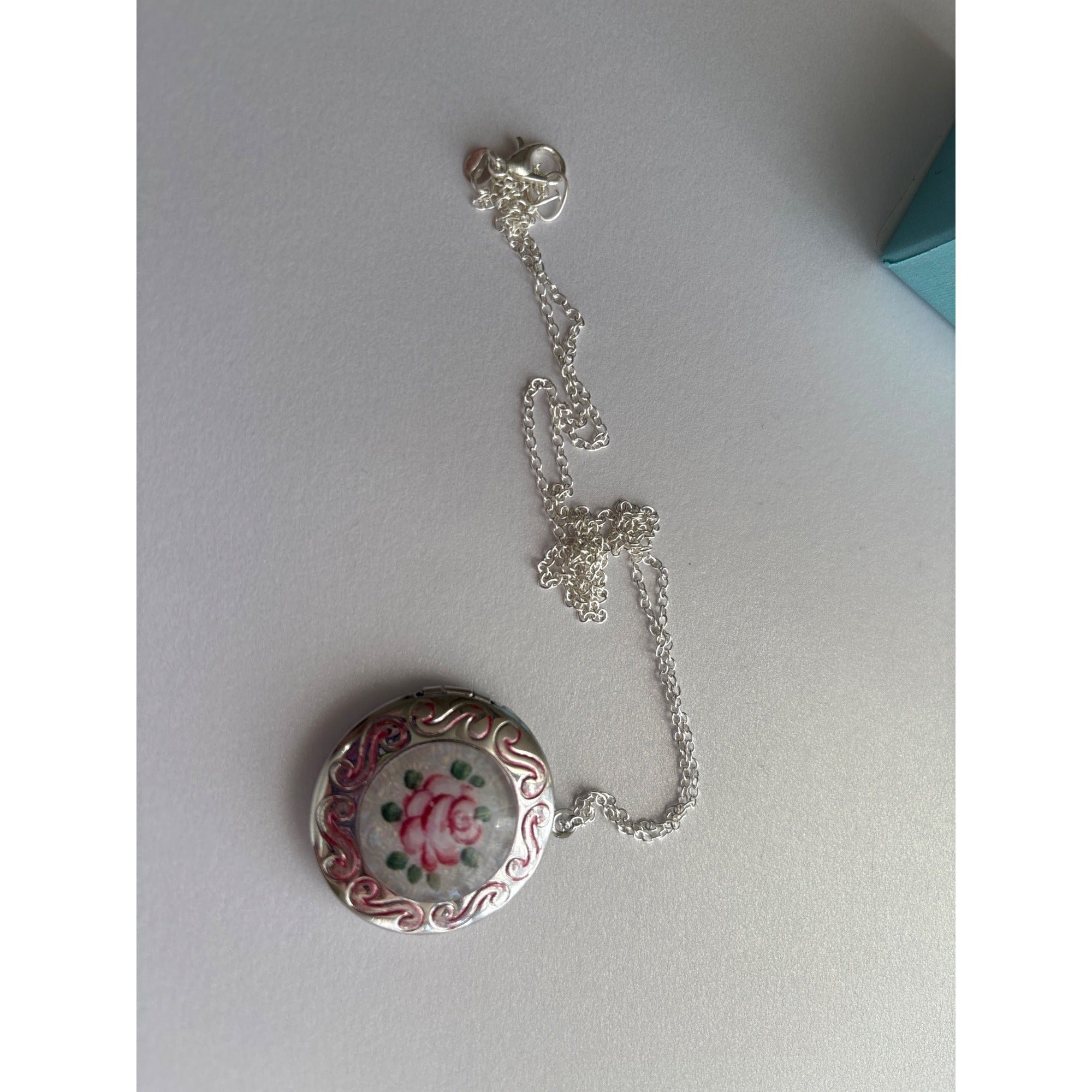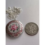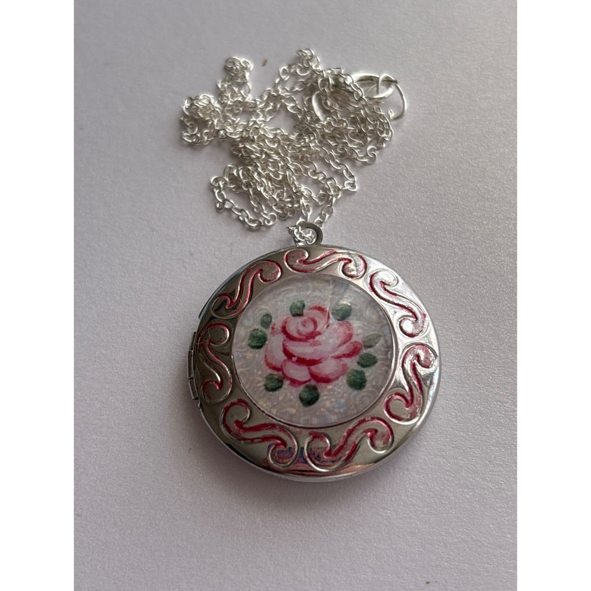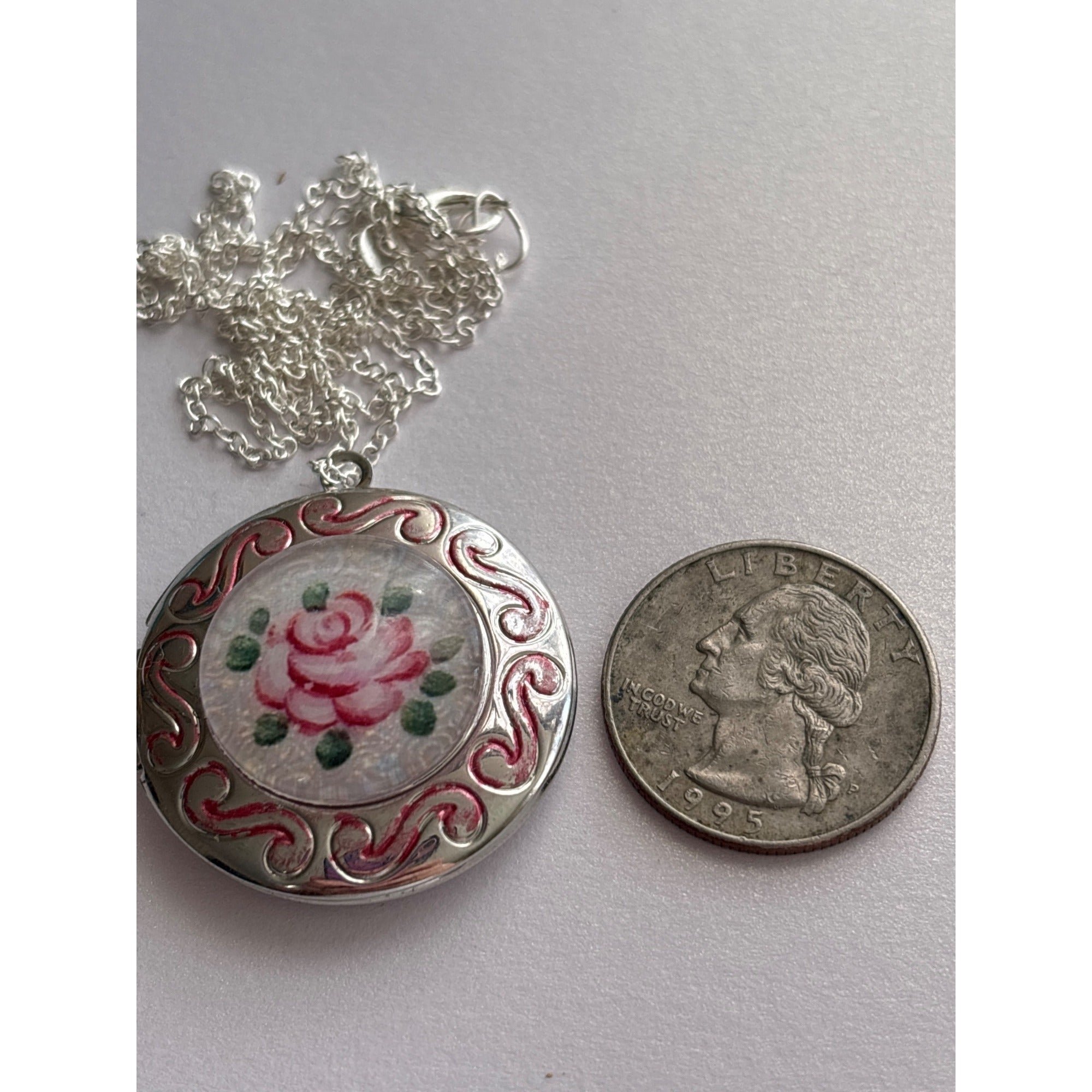 Faux Guilloché Rose Art Locket | Hand Painted Etched Border | Silver Necklace