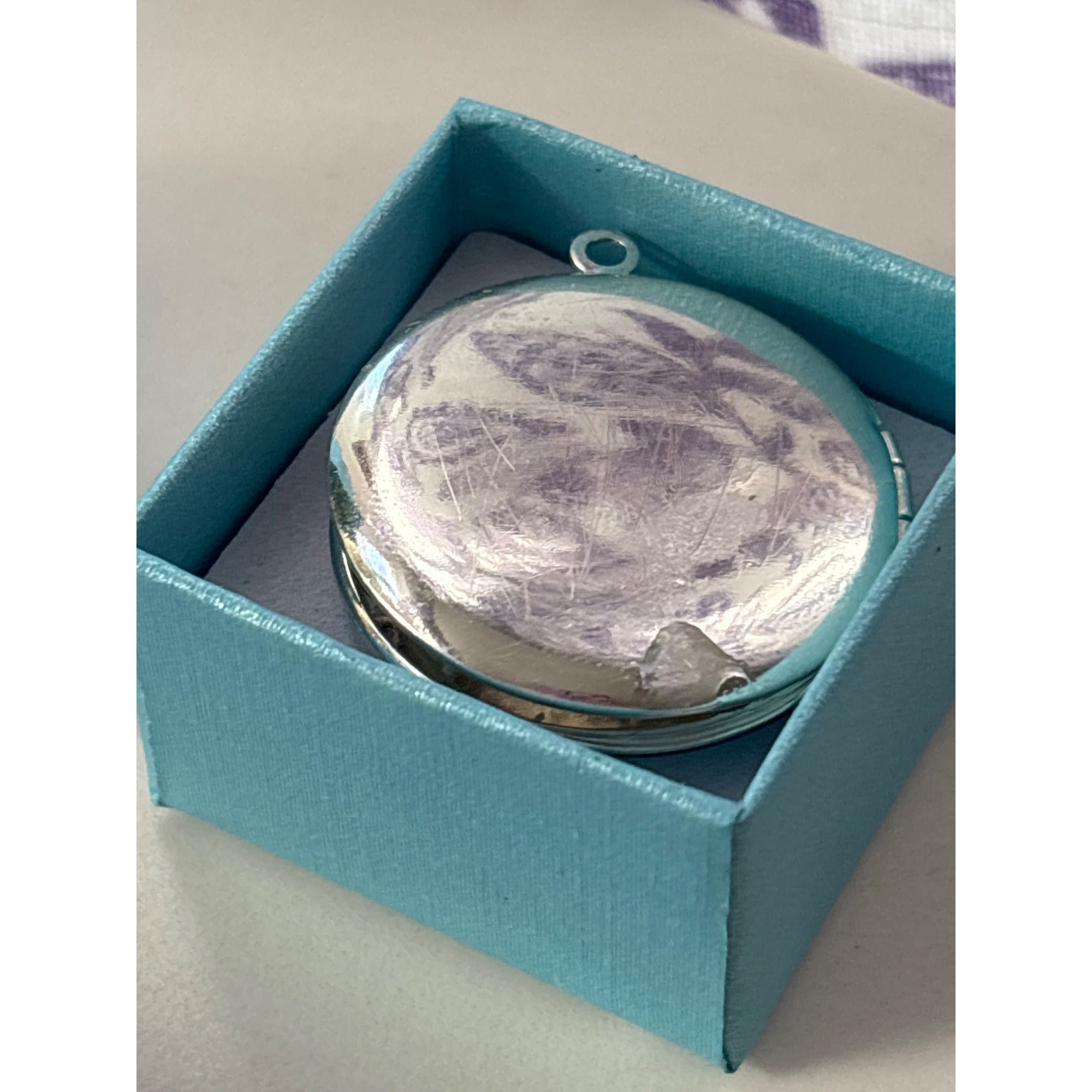 This vintage locket showcases delicate pressed blue flowers encased under glass. Its intricate silver detailing evokes timeless elegance and preserves cherished memories. • Round silver locket with intricate floral engraving • Encased pressed blue flowers under glass • Hinged design with ample space for small keepsakesScratches on the back.