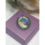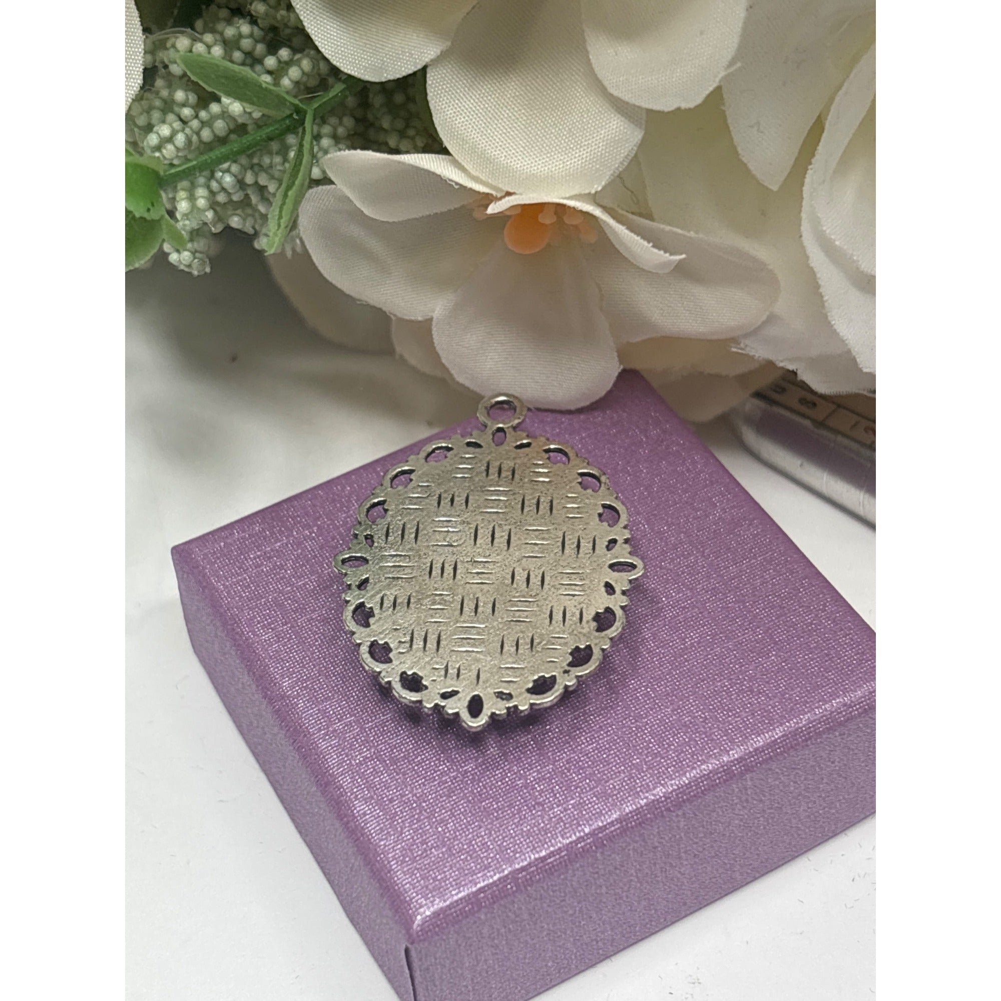 • Oval pendant with intricate filigree border • Features a vibrant bluebird design • Includes a loop for chain attachment • Durable silver-tone metalPendant = 1.5 Inches Top To Bottom, Width = 1 Inch