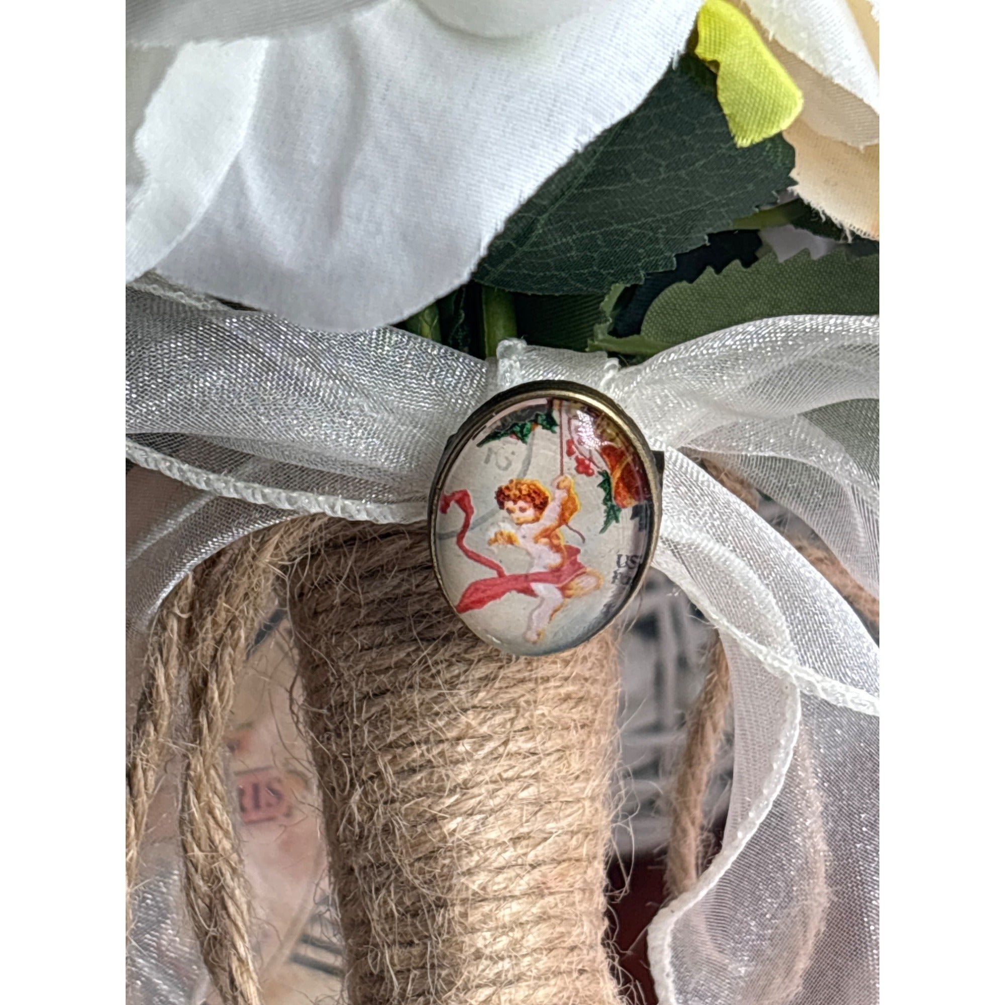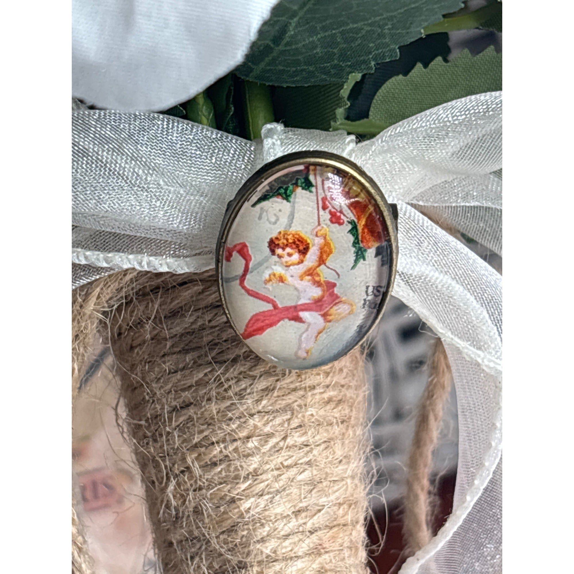 Handcrafted Mourning Brooch Cherub Vintage Postage Stamp Memorial Jewelry Bouquet Charm