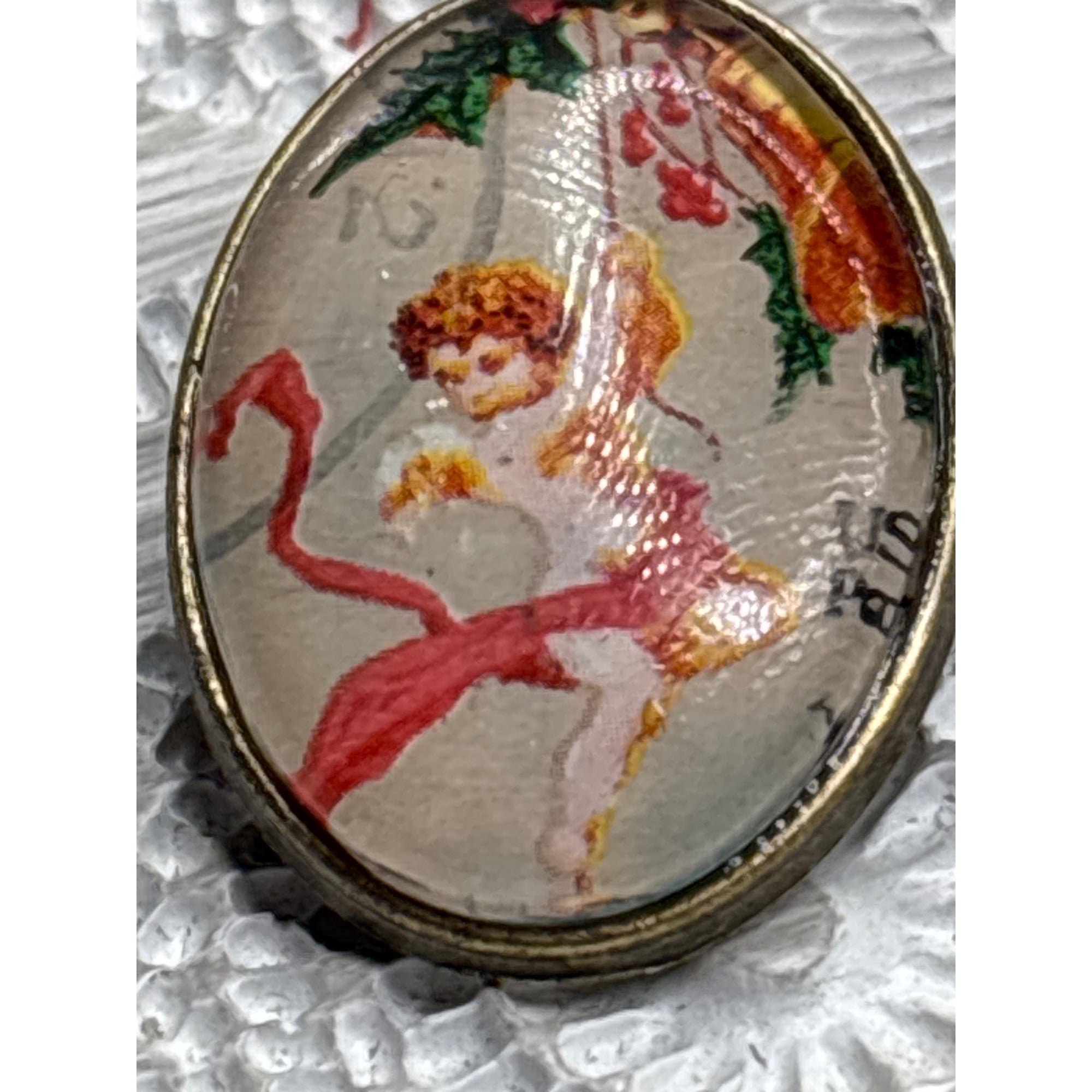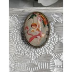 This vintage-inspired brooch features a cherub design crafted from a repurposed postage stamp. Encased under a glass dome, it reflects timeless mourning jewelry craftsmanship.• Handmade with vintage postage stamp • Cherub design encased under glass • Brass-tone metal backing • Secure pin closure for wear • Oval-shaped design for classic appealBack shows minor discoloration consistent with age. Measures approximately 1.25 inches tall by 0.75 inches wide.