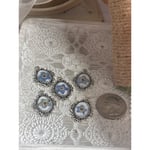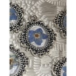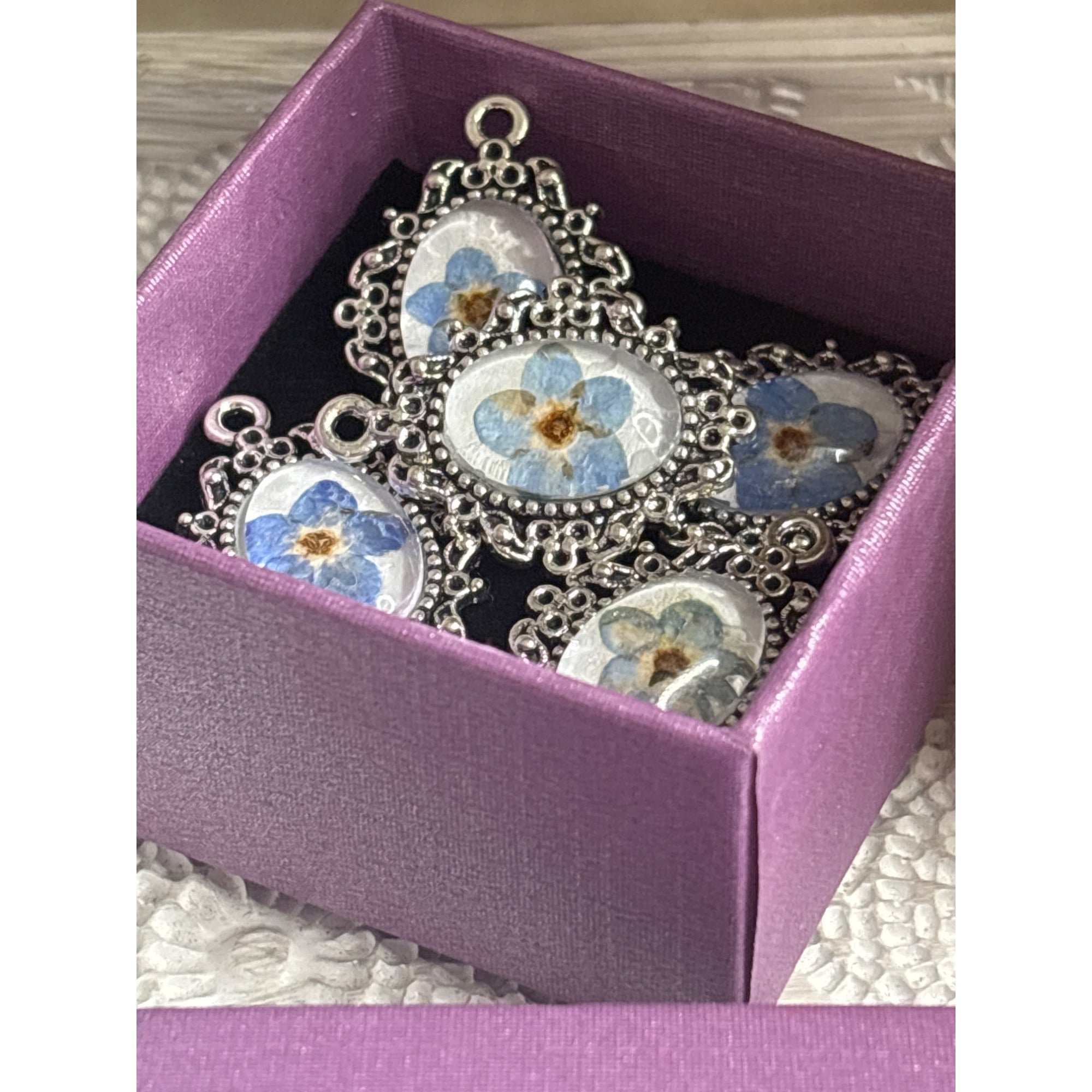 Delicately crafted with preserved forget-me-not flowers, these antique-inspired silver frame charms exude timeless elegance. Ideal for jewelry making or vintage-style crafts.I crafted these by hand, and you can see that there is color variation in each piece. • Includes 5 oval-shaped charms • Features real dried forget-me-not flowers • Intricate antique-style silver frame • Approximate size: Quarter-sized • Lightweight and versatile