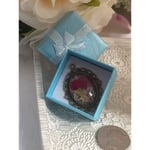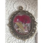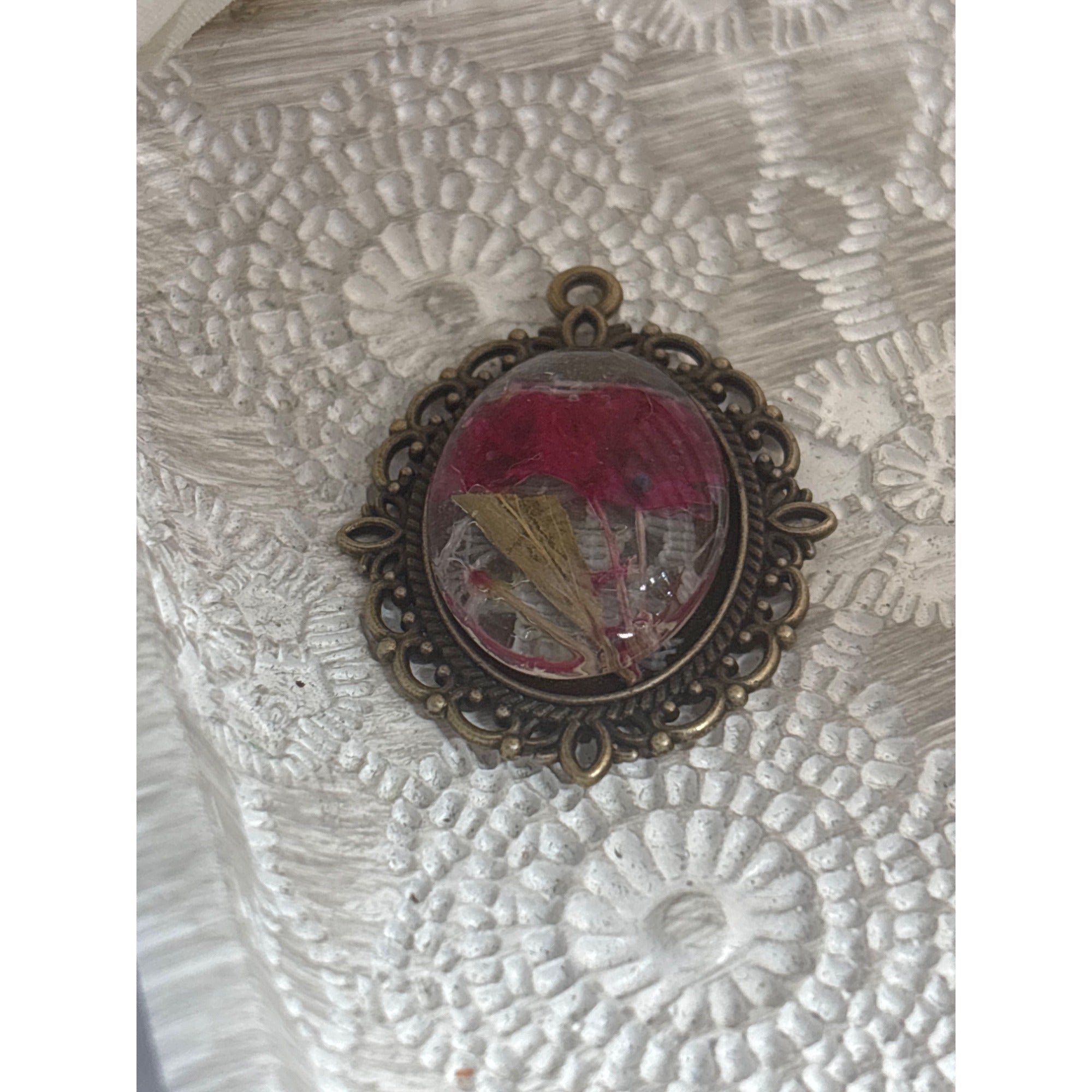 An exquisite piece of artistry, this pendant features preserved dried flowers encased in glass, framed by an ornate bronze setting, offering timeless charm.• Ornate bronze frame with detailed design • Encased dried flowers and old lace• Comes in a decorative gift box • Antique-inspired aestheticPendant diameter approximately 1.5 inches.