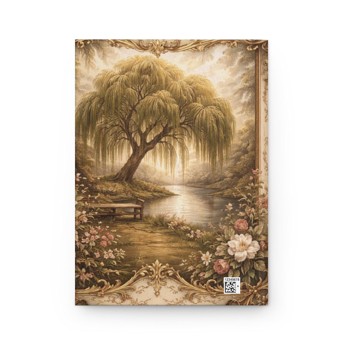 A gently matte hardcover journal wrapped in a sepia-toned memory scene. The cover shows a weeping willow beside a quiet stream, framed with ornate floral and filigree borders that feel like an heirloom. Inside, 150 lined pages with perforations and a flexible sewn spine invite long letters, private reflections, or guided remembrance notes. The full-wrap print keeps the scene continuous from front to back, while the durable matte lamination softens glare and resists fingerprints—so this book sits comfortably on a bedside table, a remembrance shelf, or carried along to quiet moments of reflection.