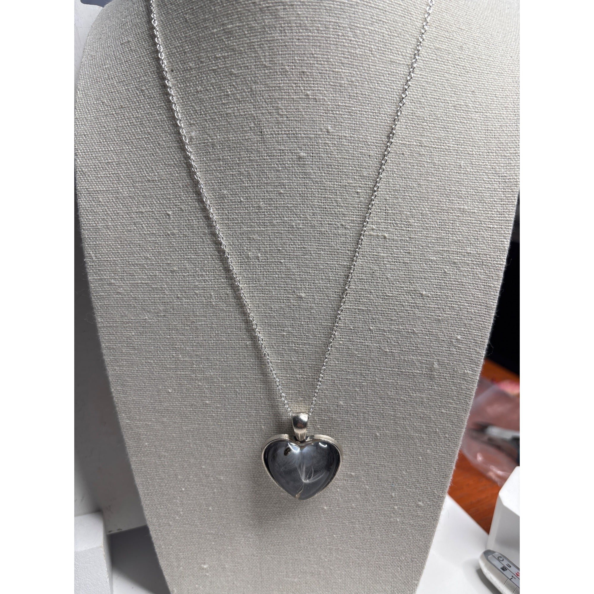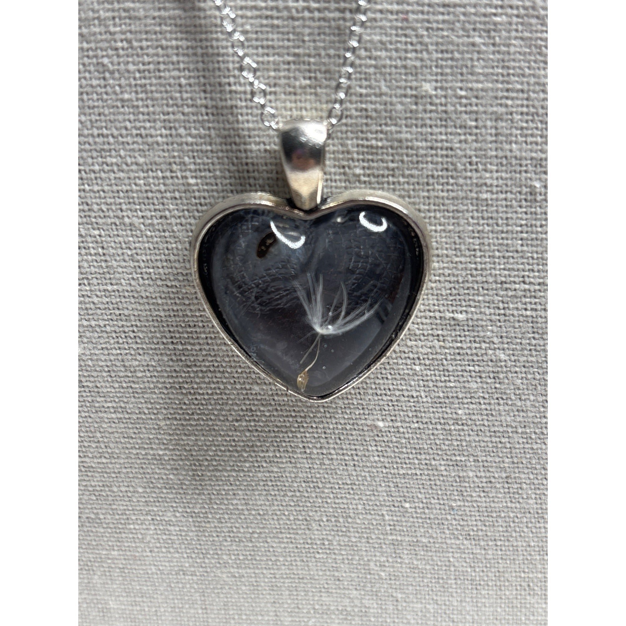 This delicate necklace captures the fleeting beauty of a single dandelion seed encased in resin. Its heart-shaped design exudes timeless elegance and charm.• Heart-shaped pendant with intricate resin design • Features real dandelion seed • Includes silver-tone chain with clasp closure • Lightweight and comfortable to wear