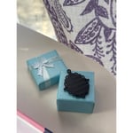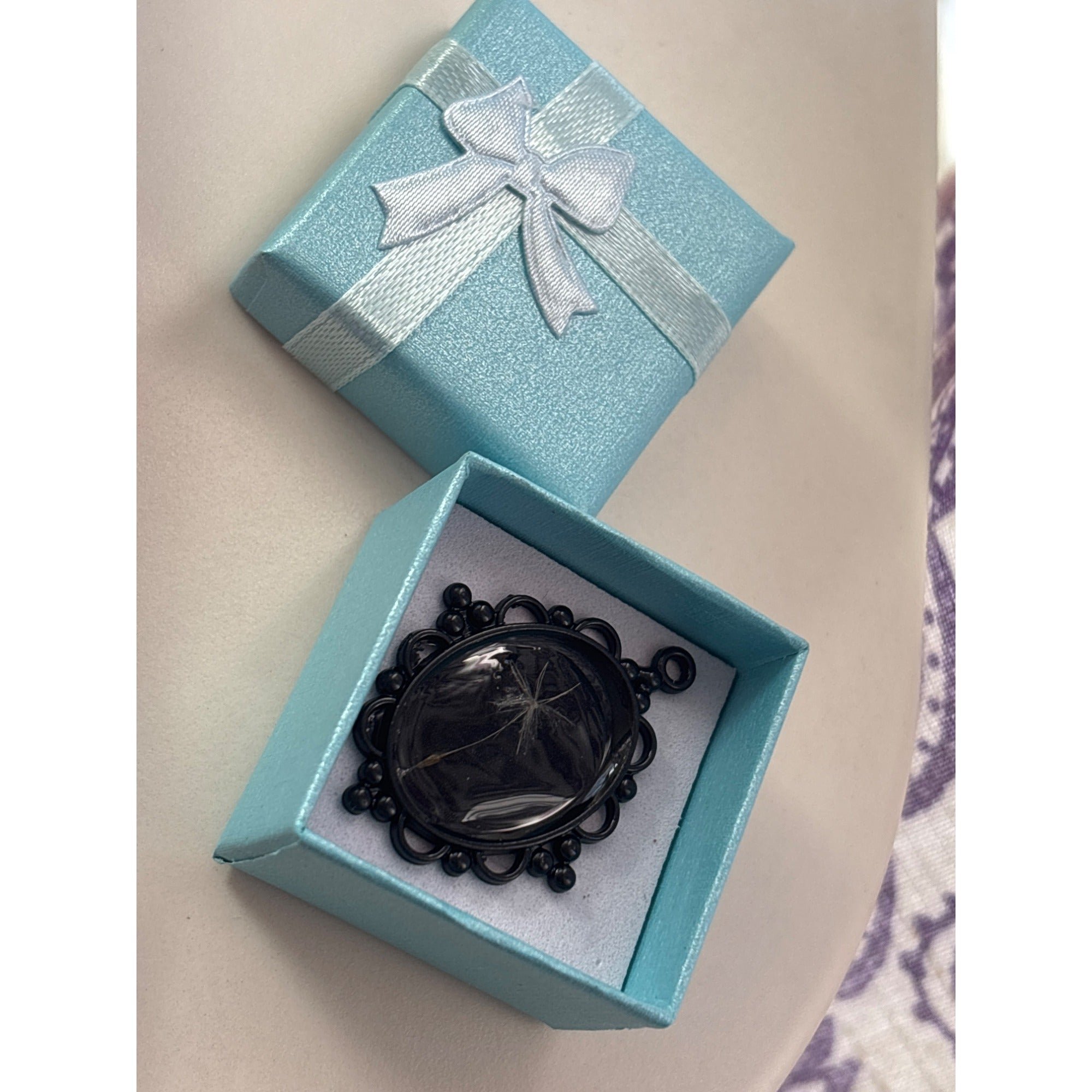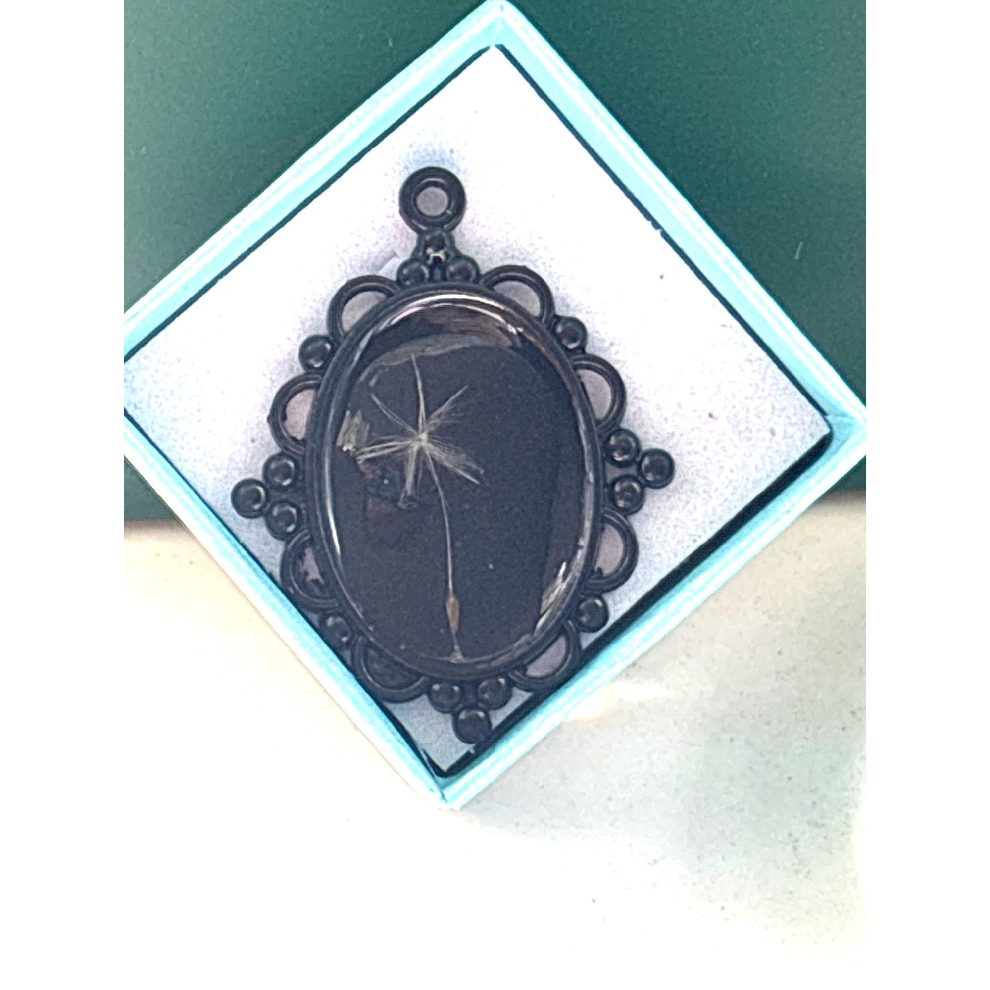 This pendant showcases a delicate dandelion seed in resin, framed by an ornate vintage-style filigree. Presented in a charming gift box, it’s a timeless keepsake. Handmade in San Diego.• Encased real dandelion seed design • Black ornate filigree frame • Comes in a decorative gift box • Lightweight and easy to wear • Suitable for casual or elegant occasionsPendant measures approximately 1.5 inches in height including loop.
