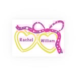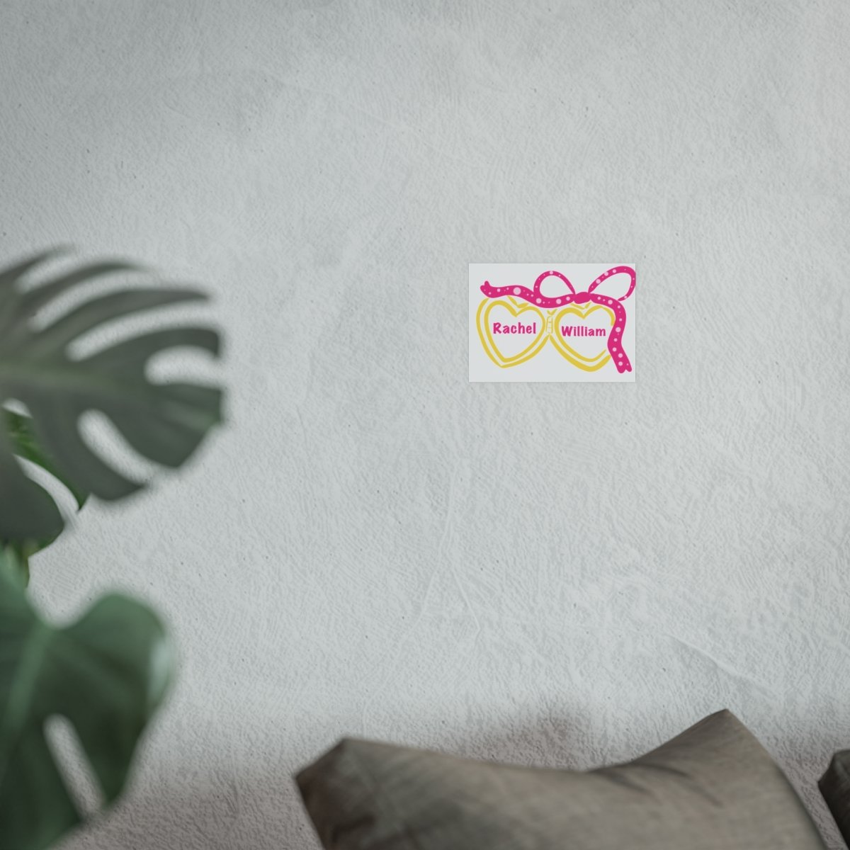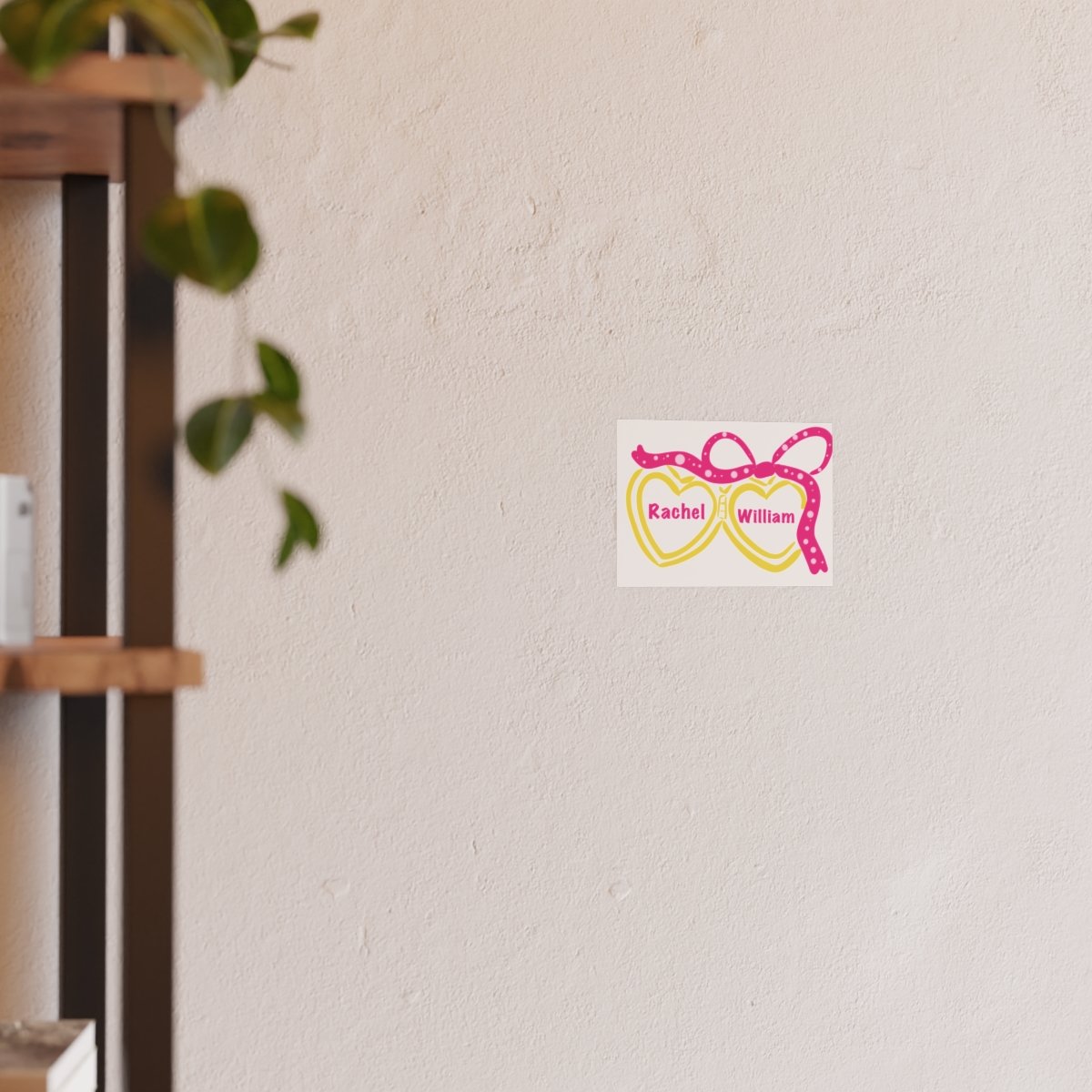 A tender, personalized art print that feels like opening a memory. A gold heart locket sits centered, ribboned with a playful polka-dot pink bow, waiting for the names that make it yours. The matte or satin paper gives the illustration a warm, handcrafted presence—soft to the eye but vivid in color. Hang it on a bedroom wall, tuck it into a keepsake corner, or place it on a stacked shelf of mementos; it reads like a quiet, everyday celebration of a relationship.