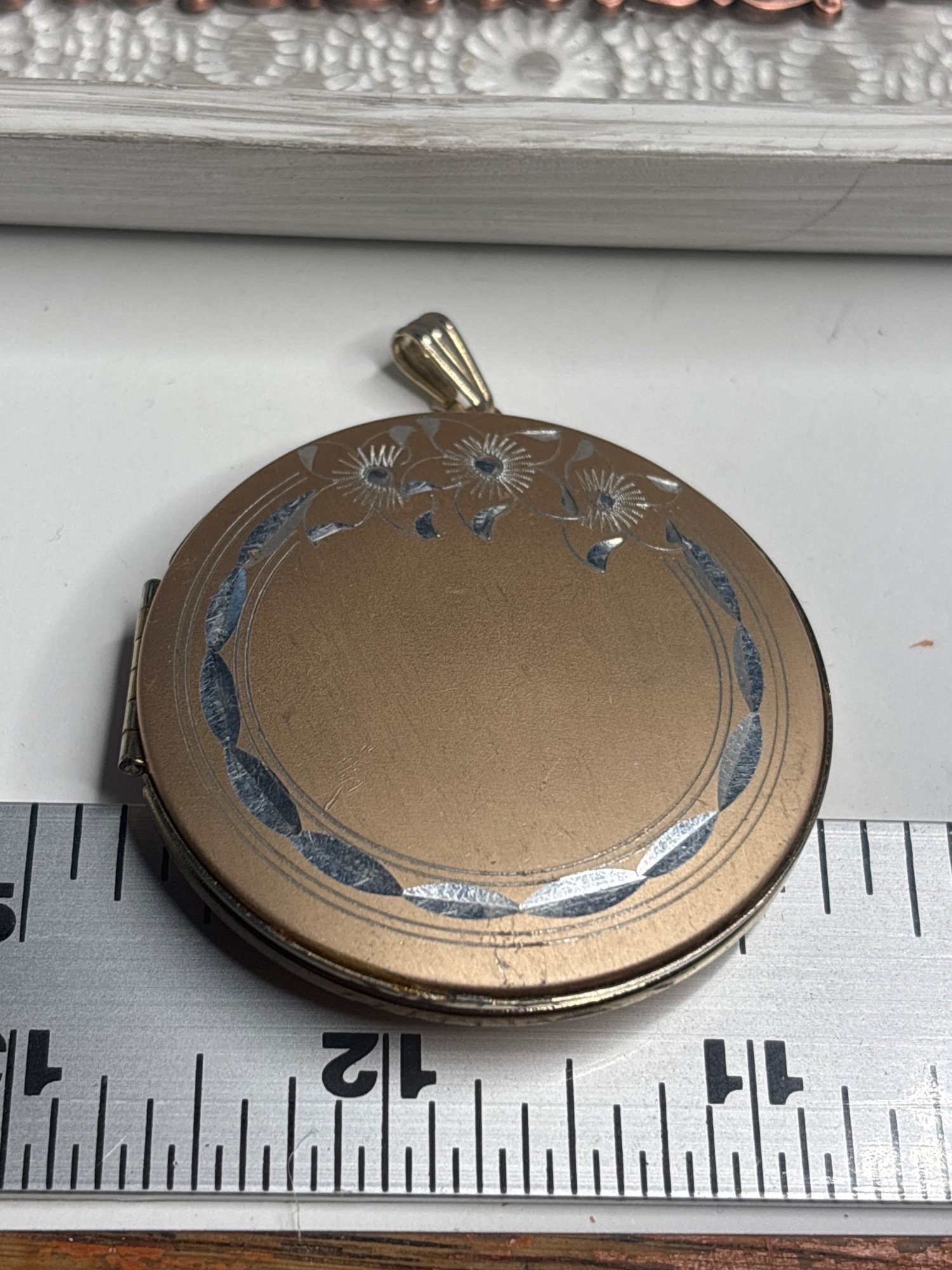 This locket is special because we discovered it with photos inside--our favorite way to imagine the locket's history. We're guessing these are high school senior photos from the 1980's or so. It's a nice size, almost 2" round (closer to 1.75")