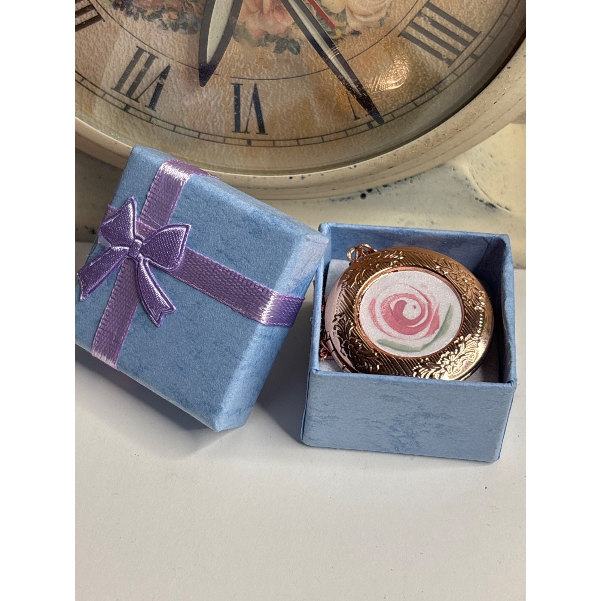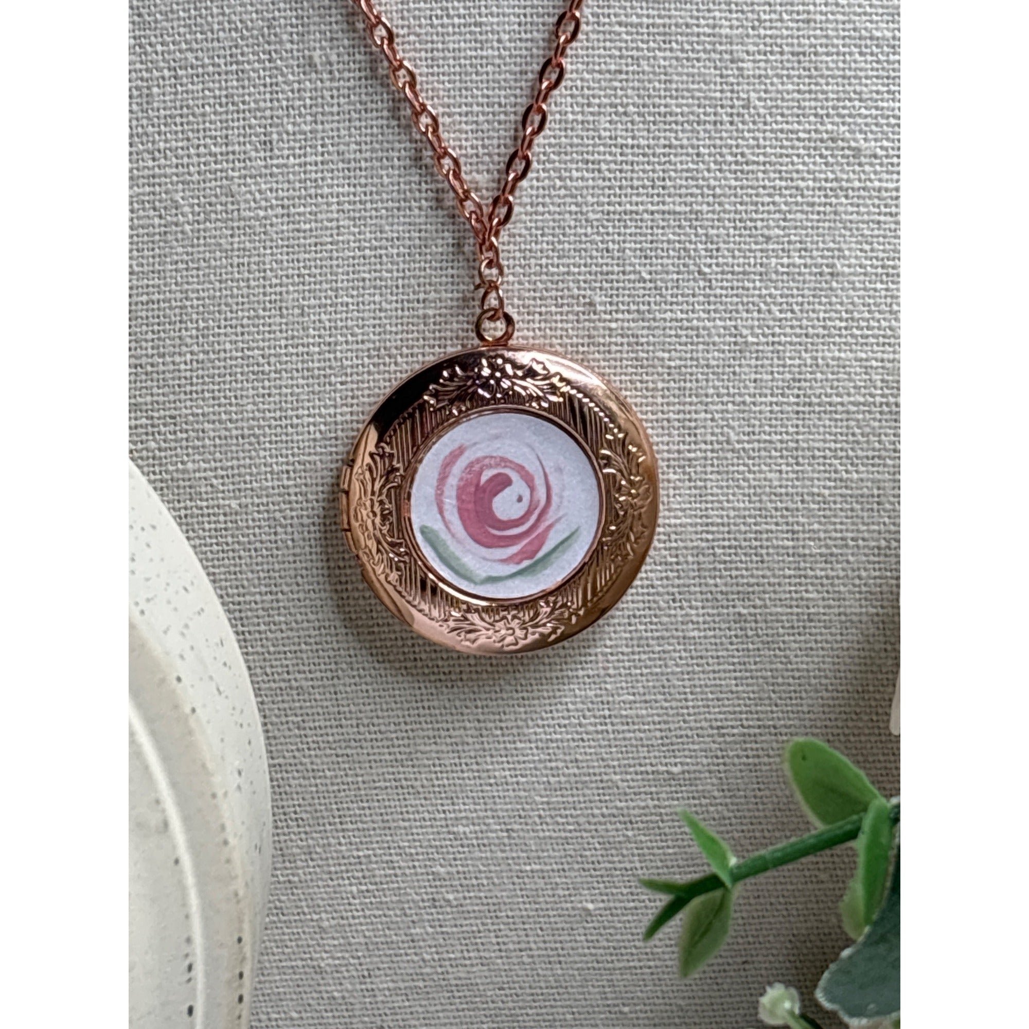 Rose Gold Photo Locket Necklace | Handpainted Rose Art | 25mm