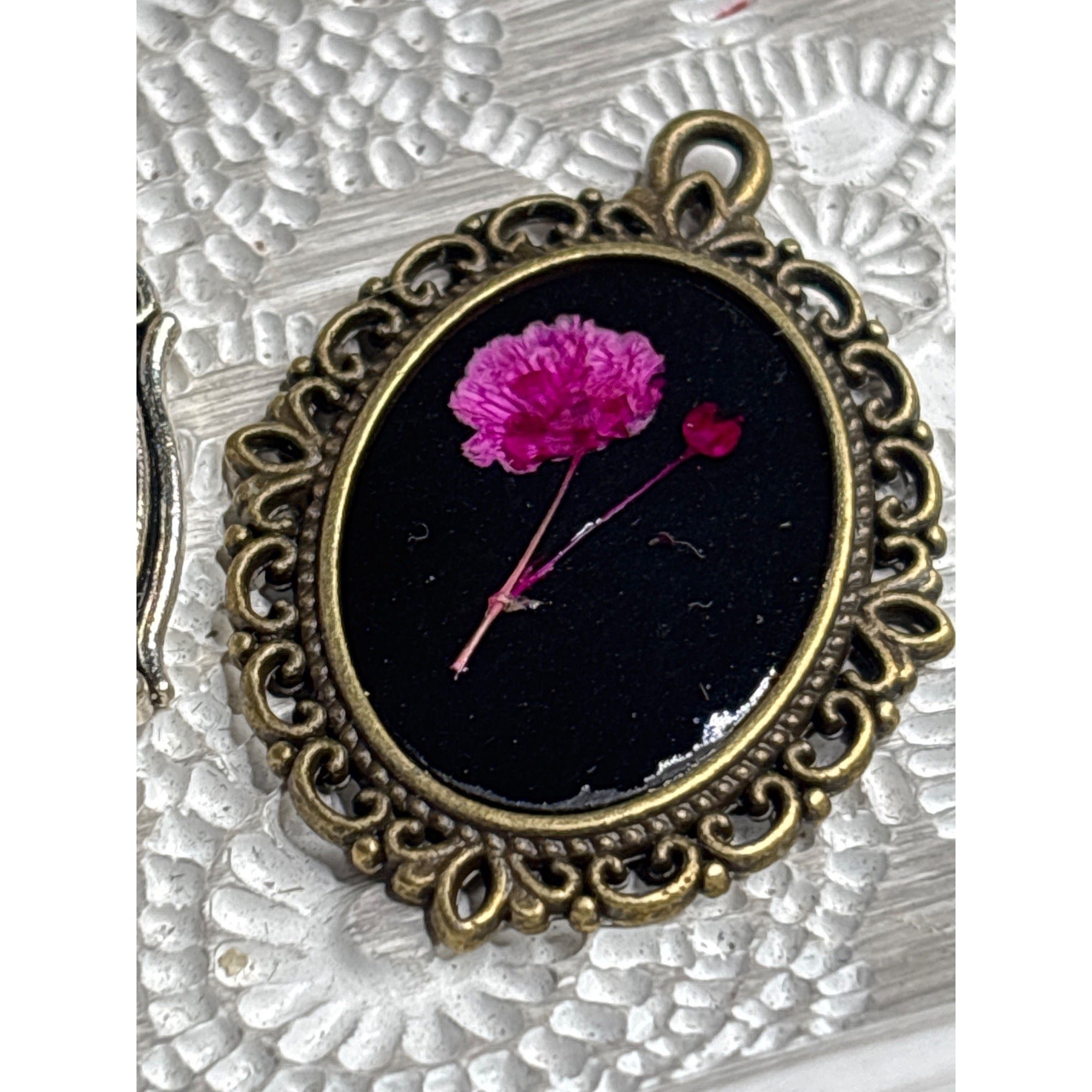 These dried flower pendants evoke a sense of timeless beauty, each nestled in an antique-style bronze frame. Their delicate designs capture a vintage charm.• Oval-shaped pendants with intricate bronze frames • Features real dried flowers sealed in resin • Ready to add a chain or incorporate into crafts • Each piece is unique in color and design • Approx. dimensions 18x25mm