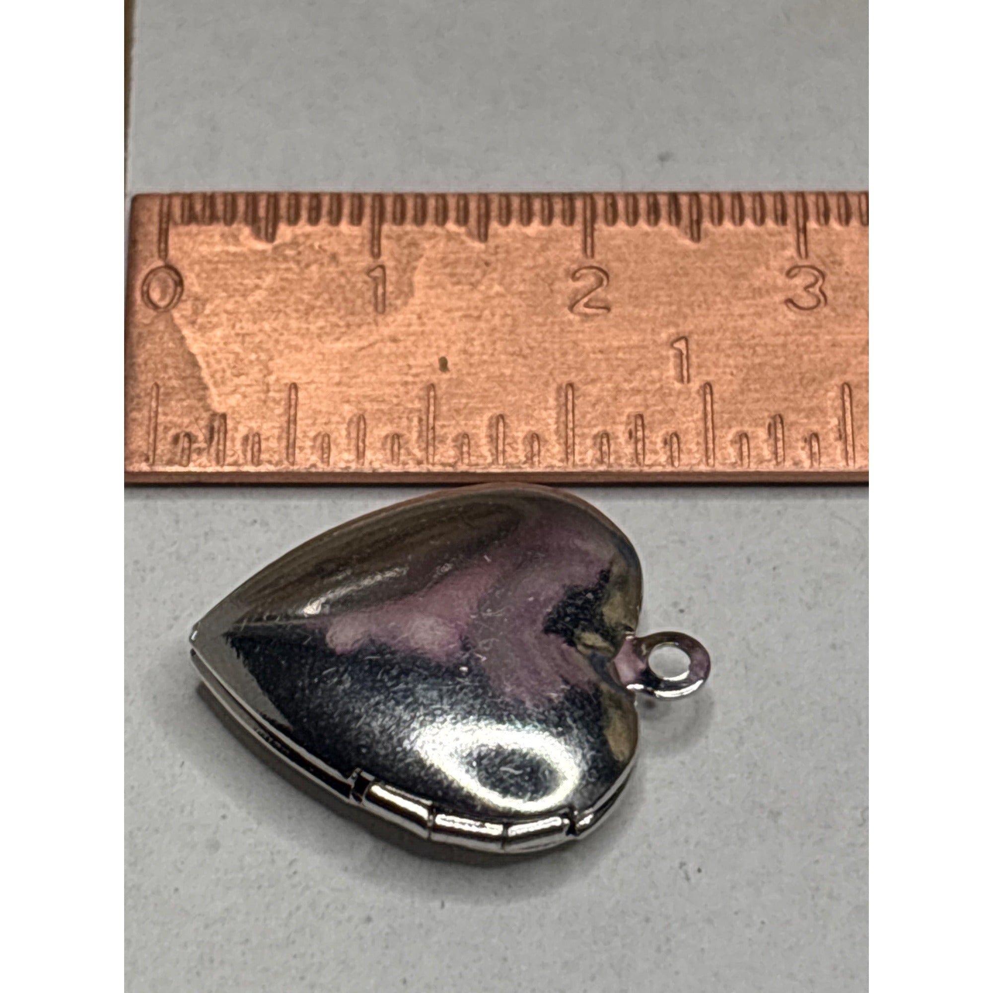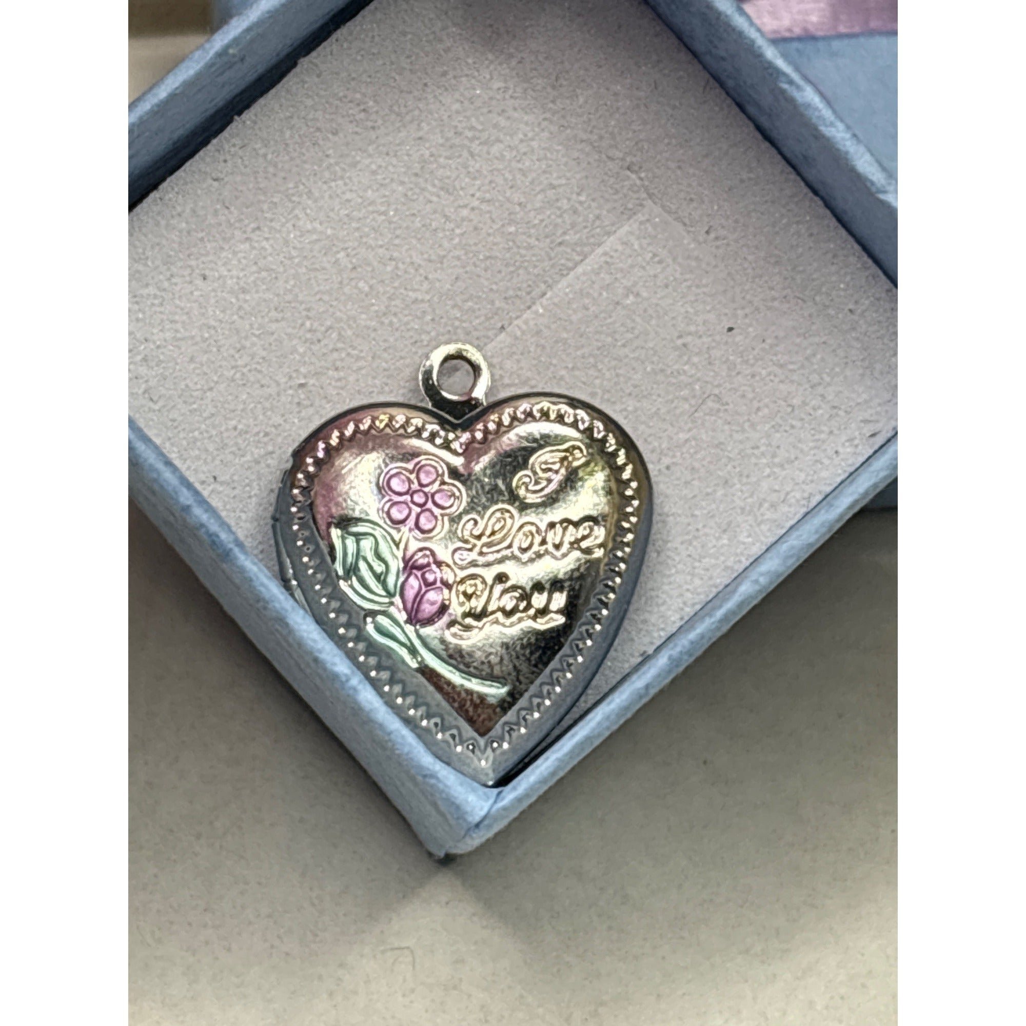 A heart-shaped locket with a detailed etched border, a painted flower design (pink/purple and green), and the message "I Love You" inscribed on the front.This is a silvertone locket which I've handpainted in purple and green. This is a sentimental keepsake jewelry piece, popular for Valentine's Day, anniversaries or birthdays.
