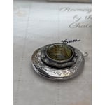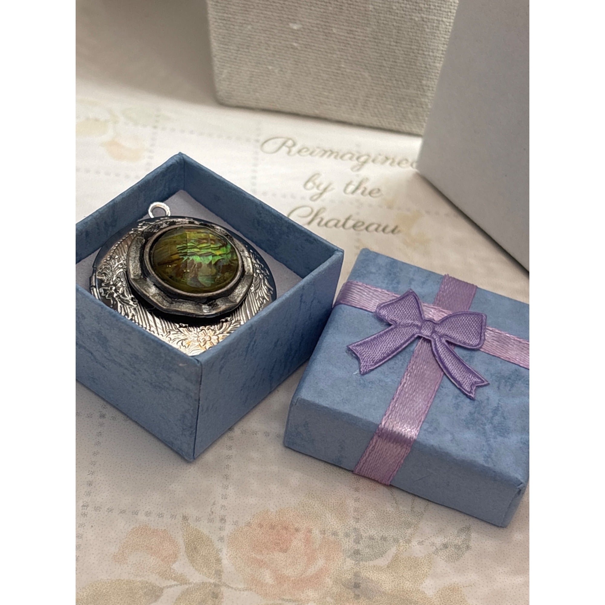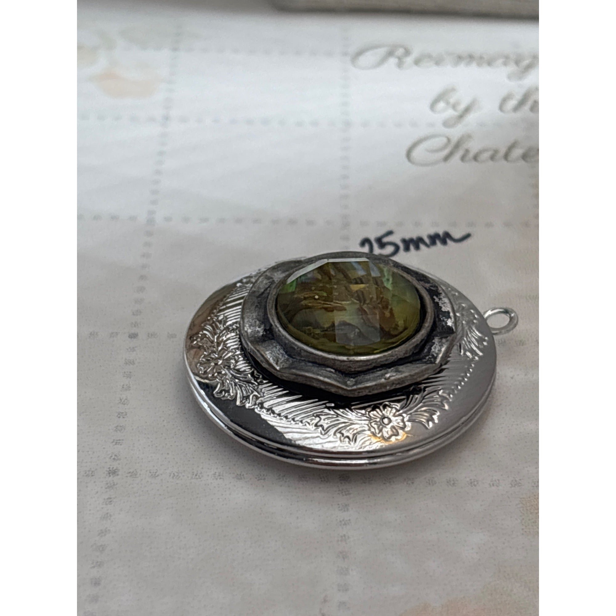 This one-of-a-kind locket showcases a vintage-inspired design with a repurposed green glass earring centerpiece, encased in ornate silver floral engraving.
