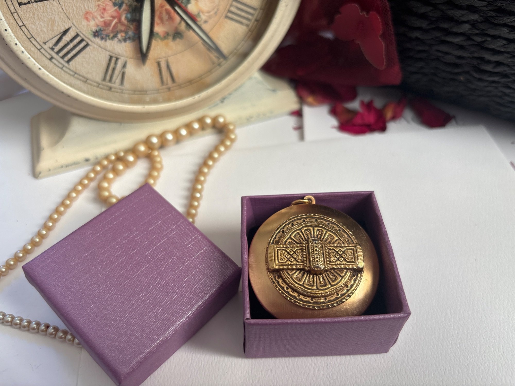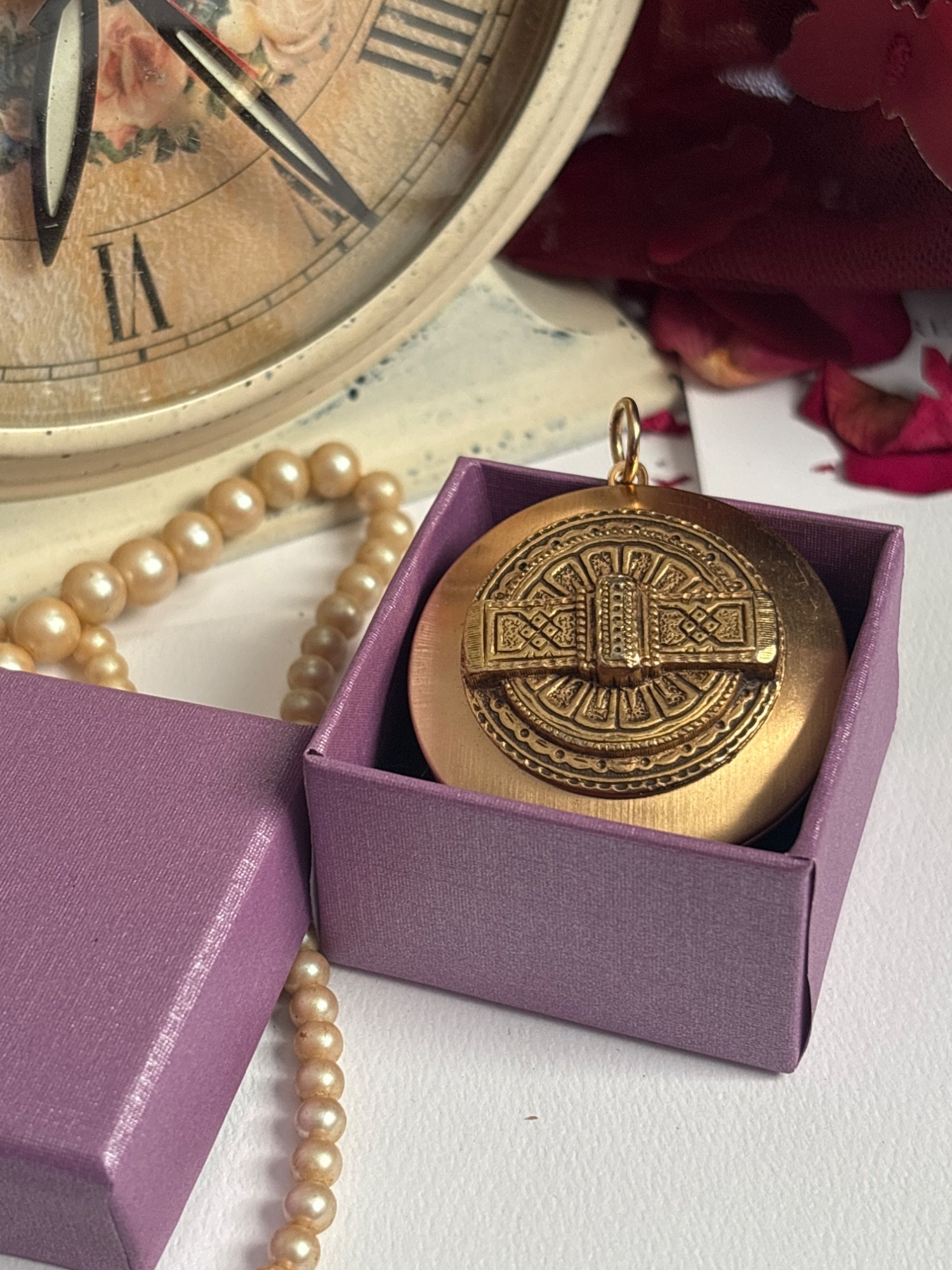 This vintage locket pendant features an intricate design and opens to reveal a mirror, adding elegance and practicality to your accessory collection. See engraving on back!