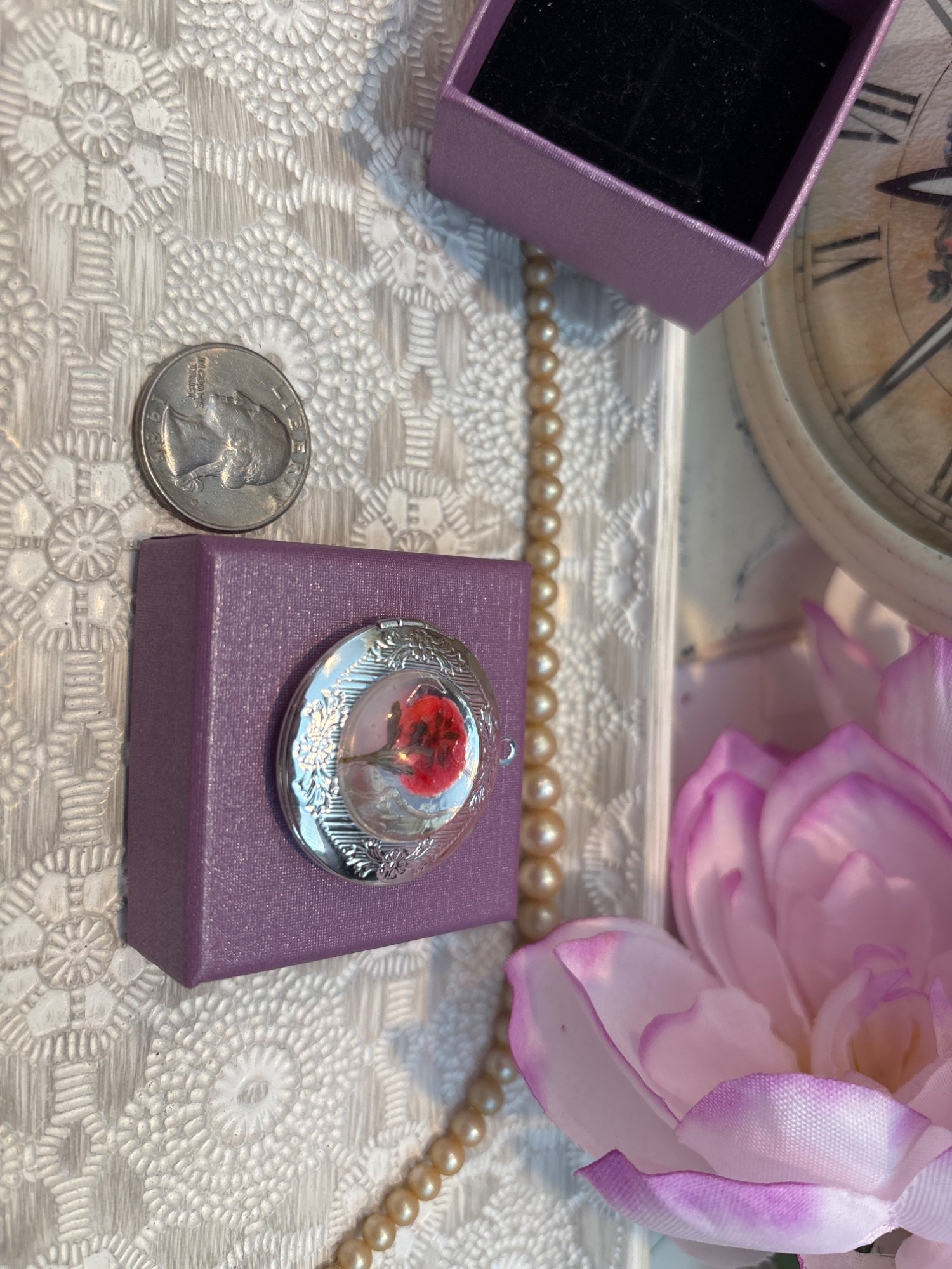 Vintage Silver Locket with Red Flower – Symbol of Courage and Strength
