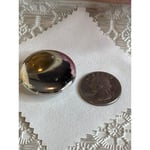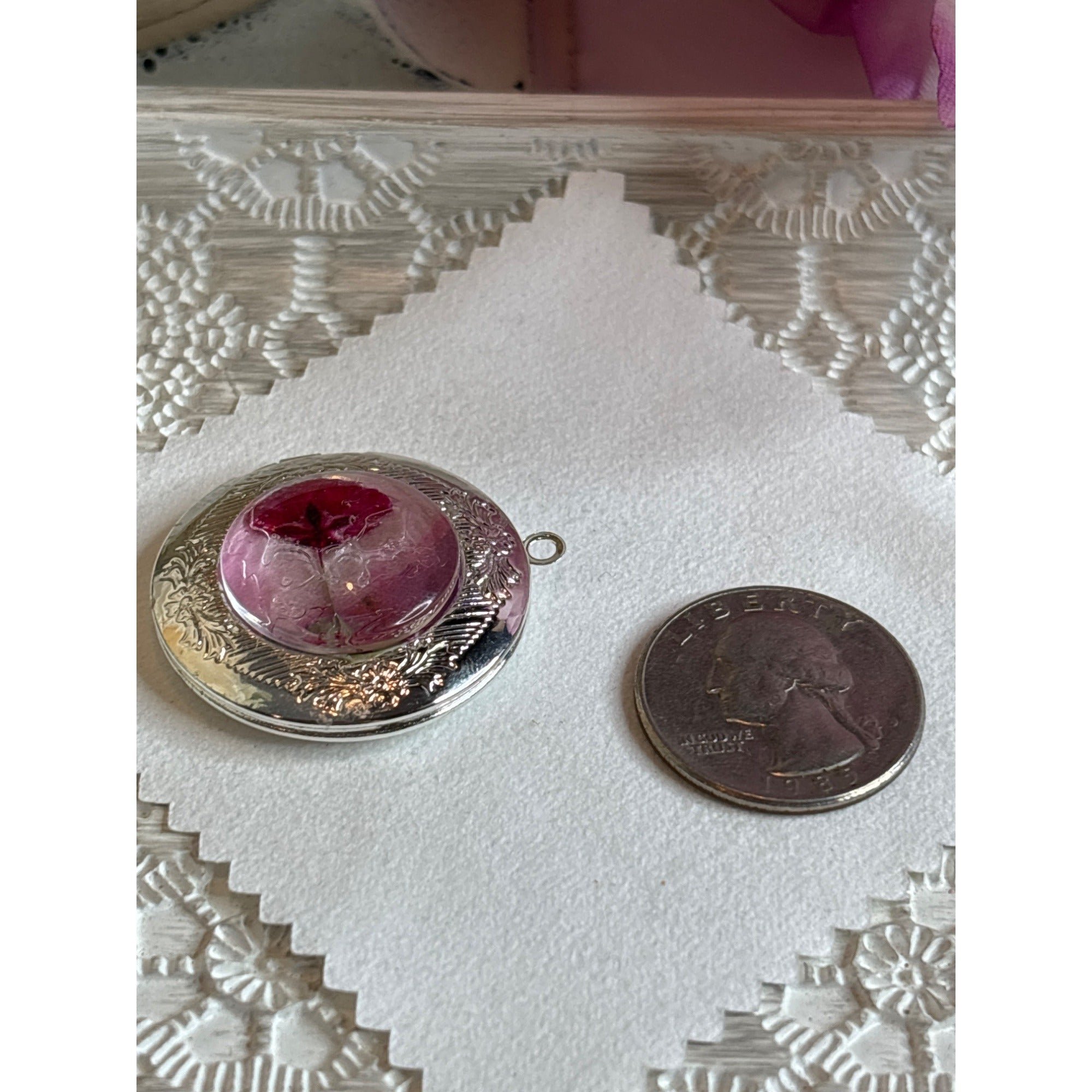 This vintage locket features a pressed flower at its center, encased within a beautifully crafted silver setting. Its intricate design evokes a sense of timeless elegance, making it a cherished piece. Ideal for preserving memories, this locket offers both aesthetic appeal and sentimental value, reminiscent of bygone eras.• Round locket pendant • Intricate silver design • Approximately the size of a quarter • Opens to hold small photos or keepsakes